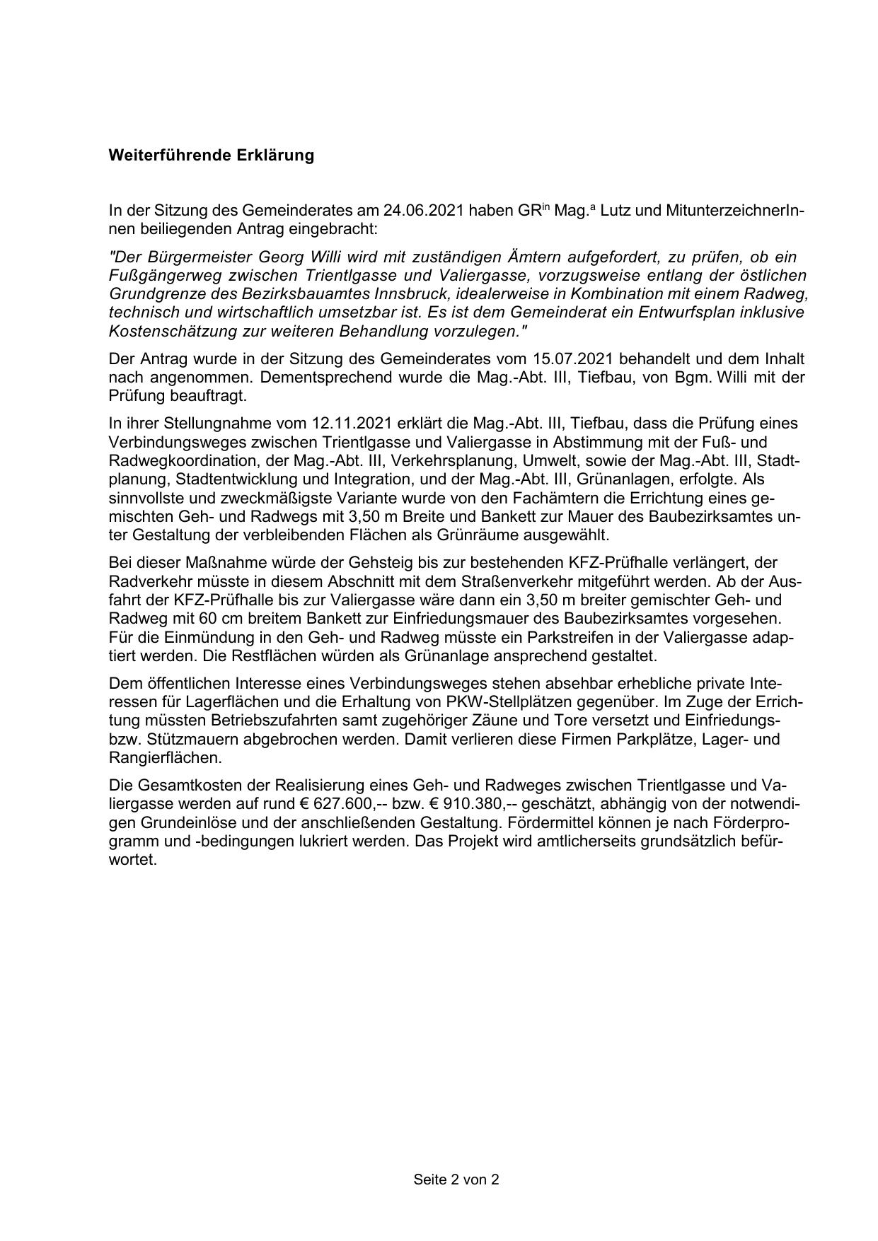 Die Gesamtkosten der Realisierung eines Geh- und Radweges zwischen Trientlgasse und Valiergasse werden auf rund € 627.600,-- bzw. € 910.380,-- geschätzt, abhängig von der notwendigen Grundeinlöse und der anschließenden Gestaltung. Fördermittel können je nach Förderprogramm und -bedingungen lukriert werden. Das Projekt wird amtlicherseits grundsätzlich befürwortet.
