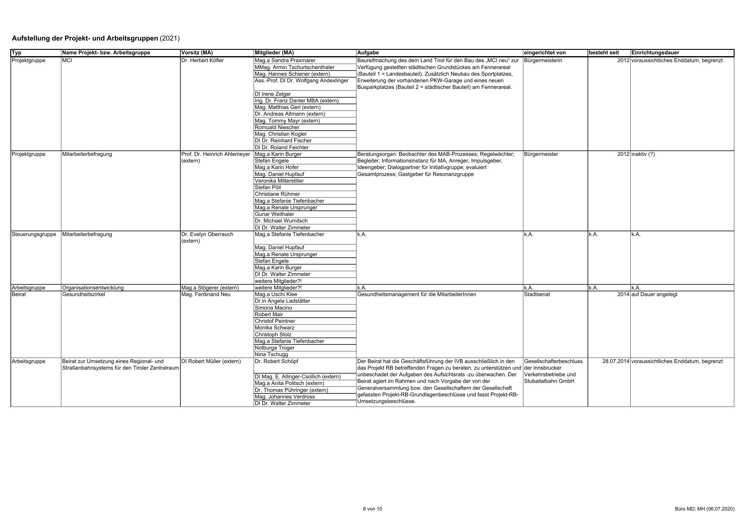 Aufstellung der Projekt- und Arbeitsgruppen (2021)