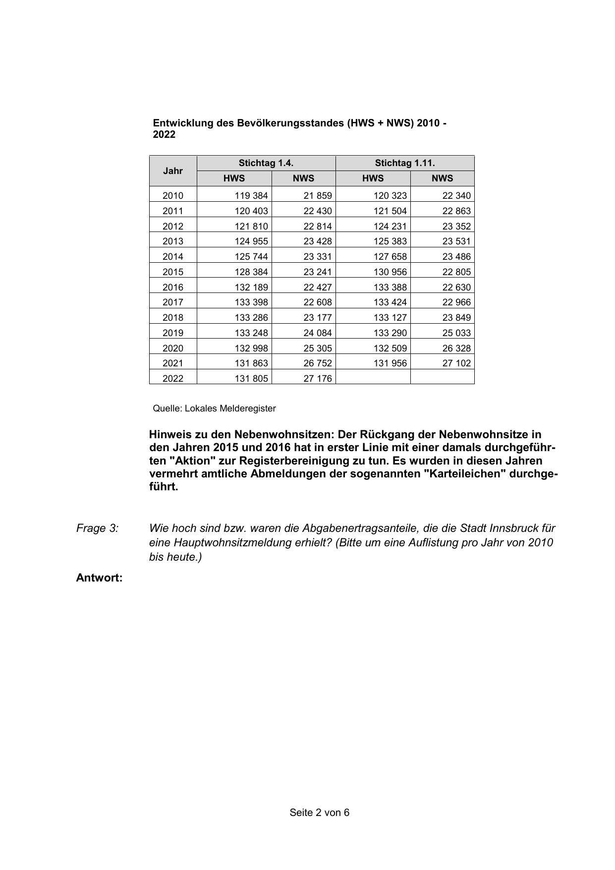 eine Hauptwohnsitzmeldung erhielt? (Bitte um eine Auflistung pro Jahr von 2010