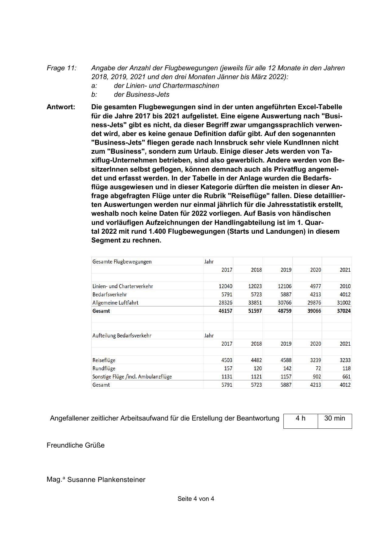zum "Business", sondern zum Urlaub. Einige dieser Jets werden von Taxiflug-Unternehmen betrieben, sind also gewerblich. Andere werden von BesitzerInnen selbst geflogen, können demnach auch als Privatflug angemeldet und erfasst werden. In der Tabelle in der Anlage wurden die Bedarfsflüge ausgewiesen und in dieser Kategorie dürften die meisten in dieser Anfrage abgefragten Flüge unter die Rubrik "Reiseflüge" fallen. Diese detaillierten Auswertungen werden nur einmal jährlich für die Jahresstatistik erstellt,