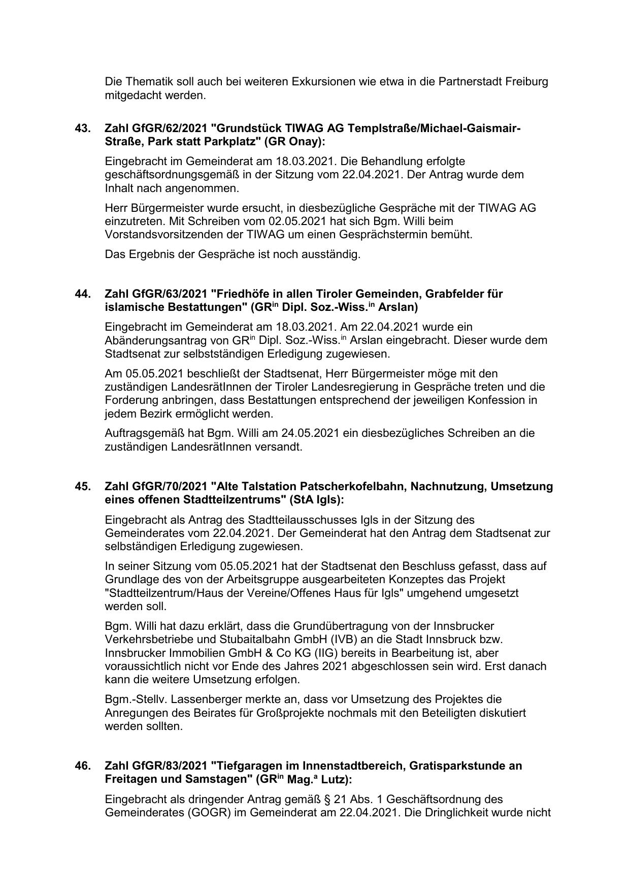 Zahl GfGR/62/2021 "Grundstück TIWAG AG Templstraße/Michael-GaismairStraße, Park statt Parkplatz" (GR Onay):