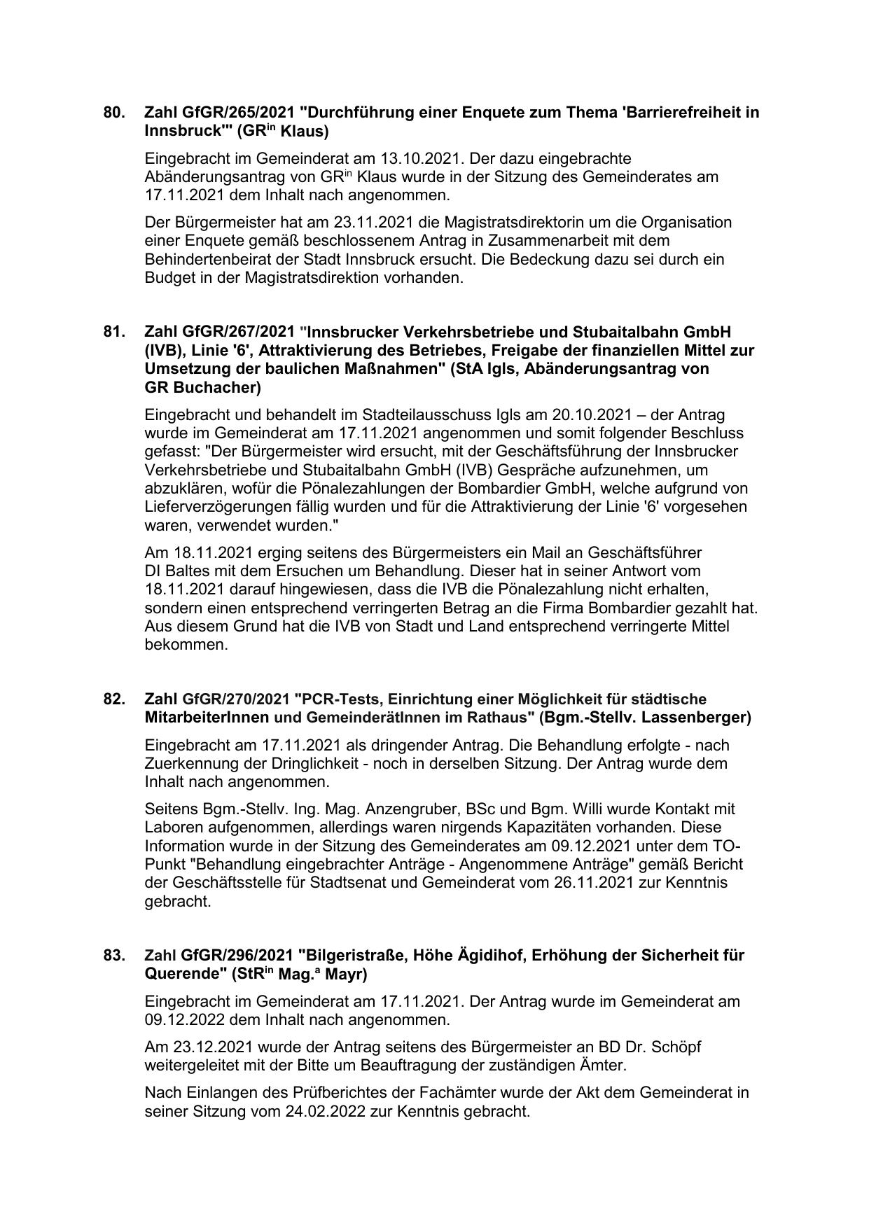 Information wurde in der Sitzung des Gemeinderates am 09.12.2021 unter dem TOPunkt "Behandlung eingebrachter Anträge - Angenommene Anträge" gemäß Bericht