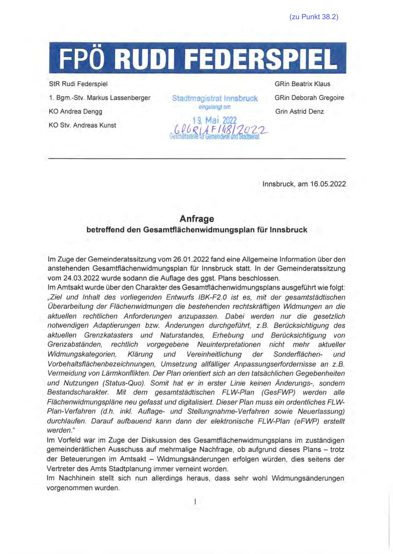 betreffend den Gesamtflächenwidmungsplan für Innsbruck
