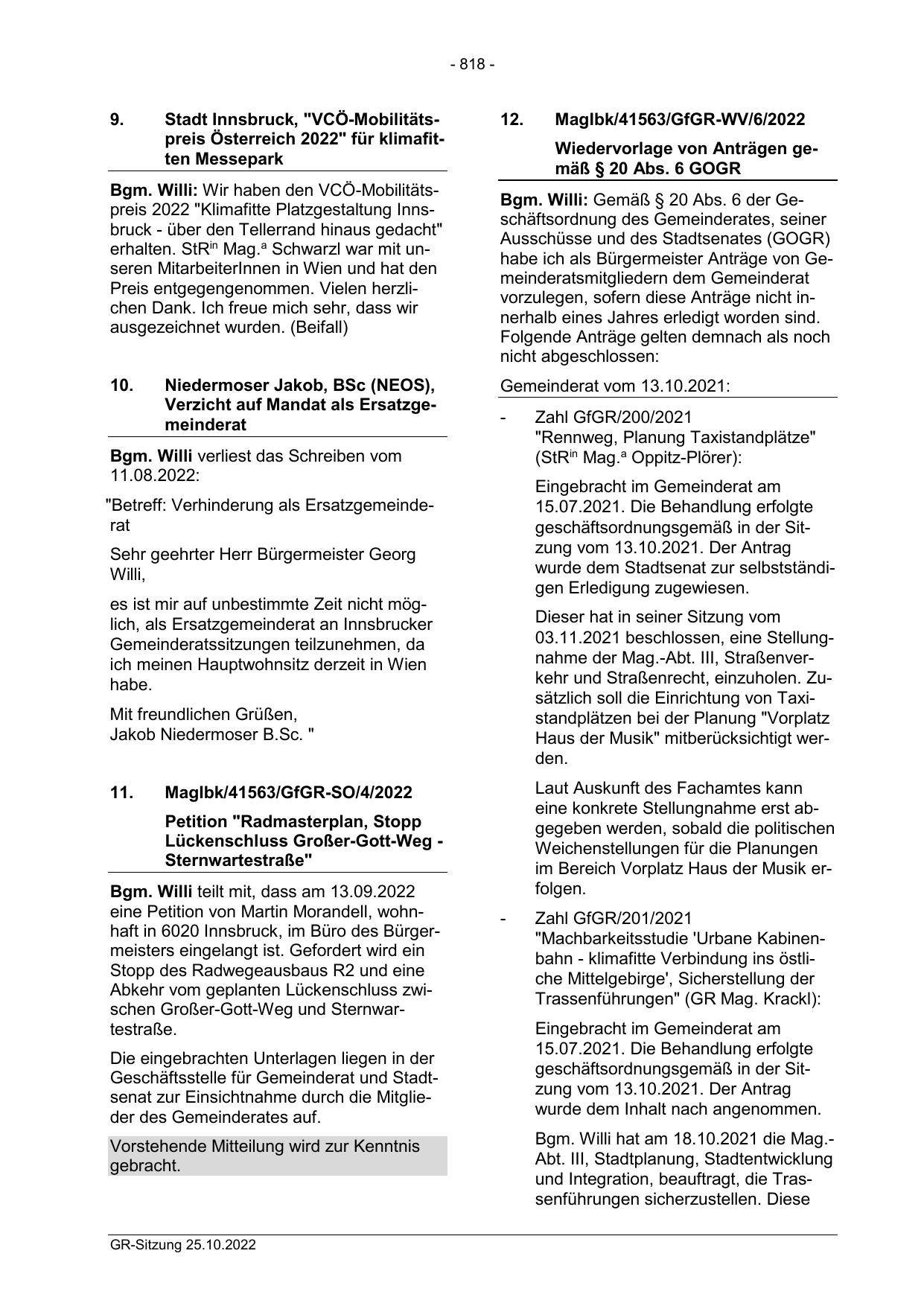 Bgm. Willi: Gemäß § 20 Abs. 6 der Geschäftsordnung des Gemeinderates, seiner