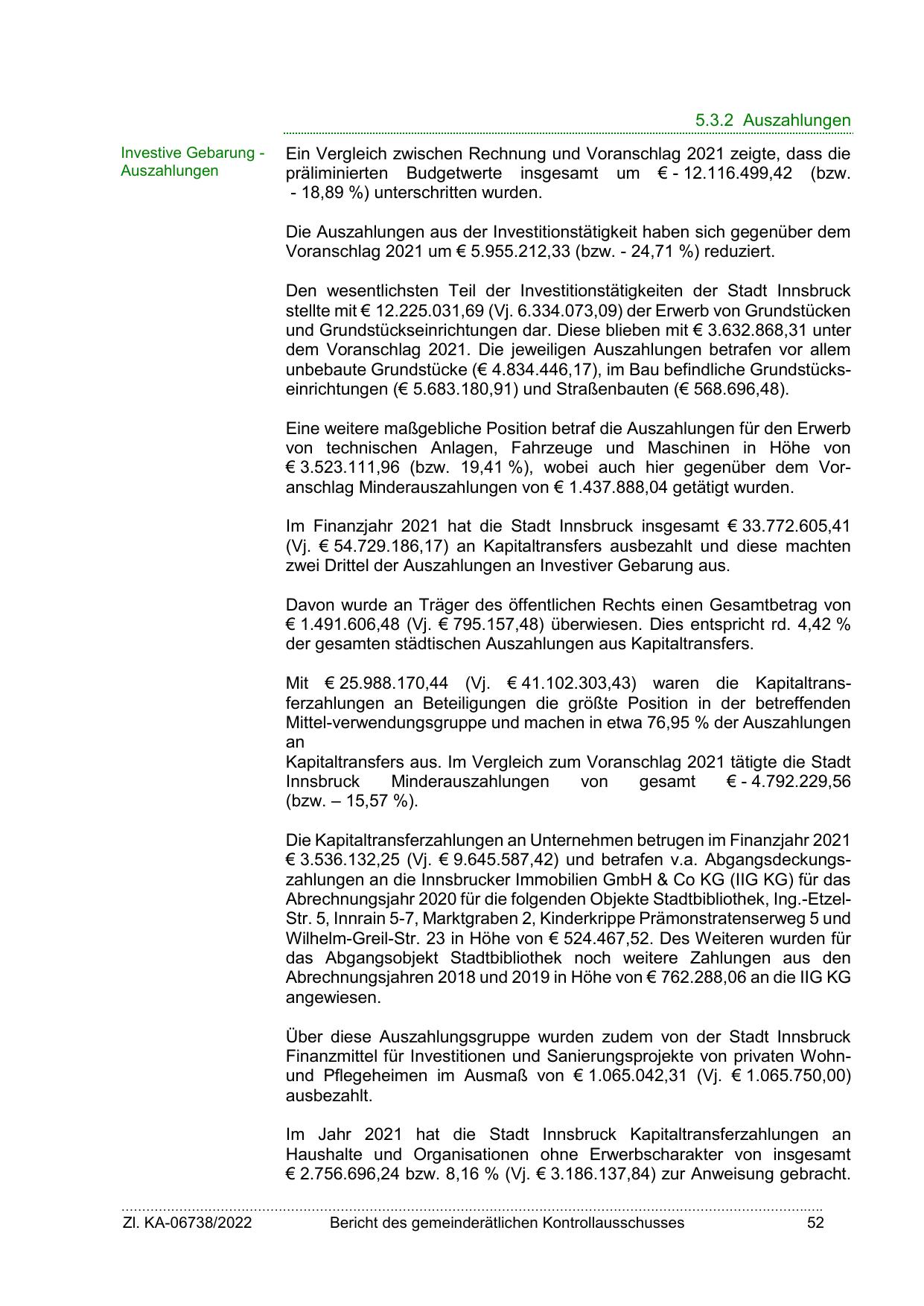 € 3.536.132,25 (Vj. € 9.645.587,42) und betrafen v.a. Abgangsdeckungszahlungen an die Innsbrucker Immobilien GmbH & Co KG (IIG KG) für das