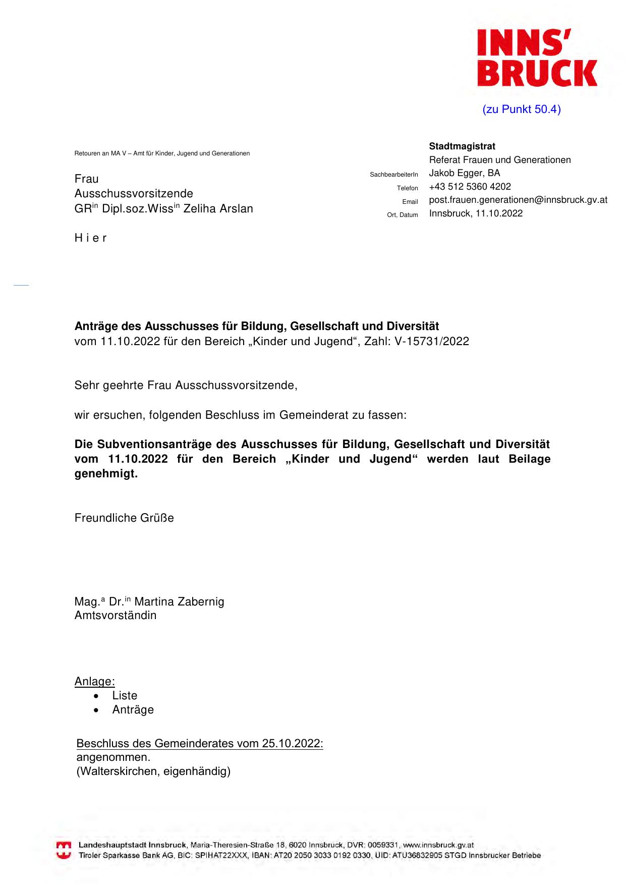 vom 11.10.2022 für den Bereich „Kinder und Jugend“, Zahl: V-15731/2022