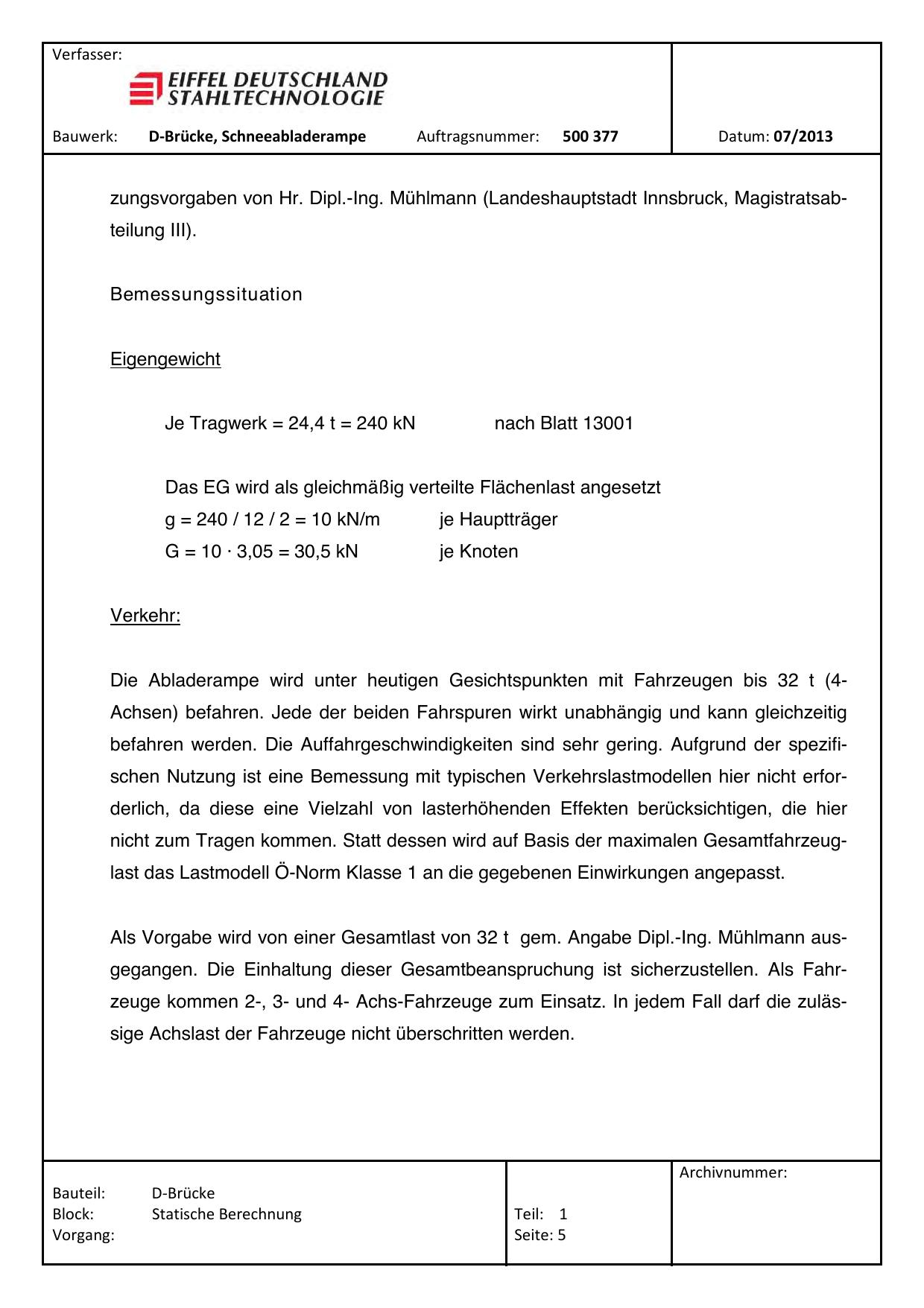 nicht zum Tragen kommen. Statt dessen wird auf Basis der maximalen Gesamtfahrzeuglast das Lastmodell Ö-Norm Klasse 1 an die gegebenen Einwirkungen angepasst.