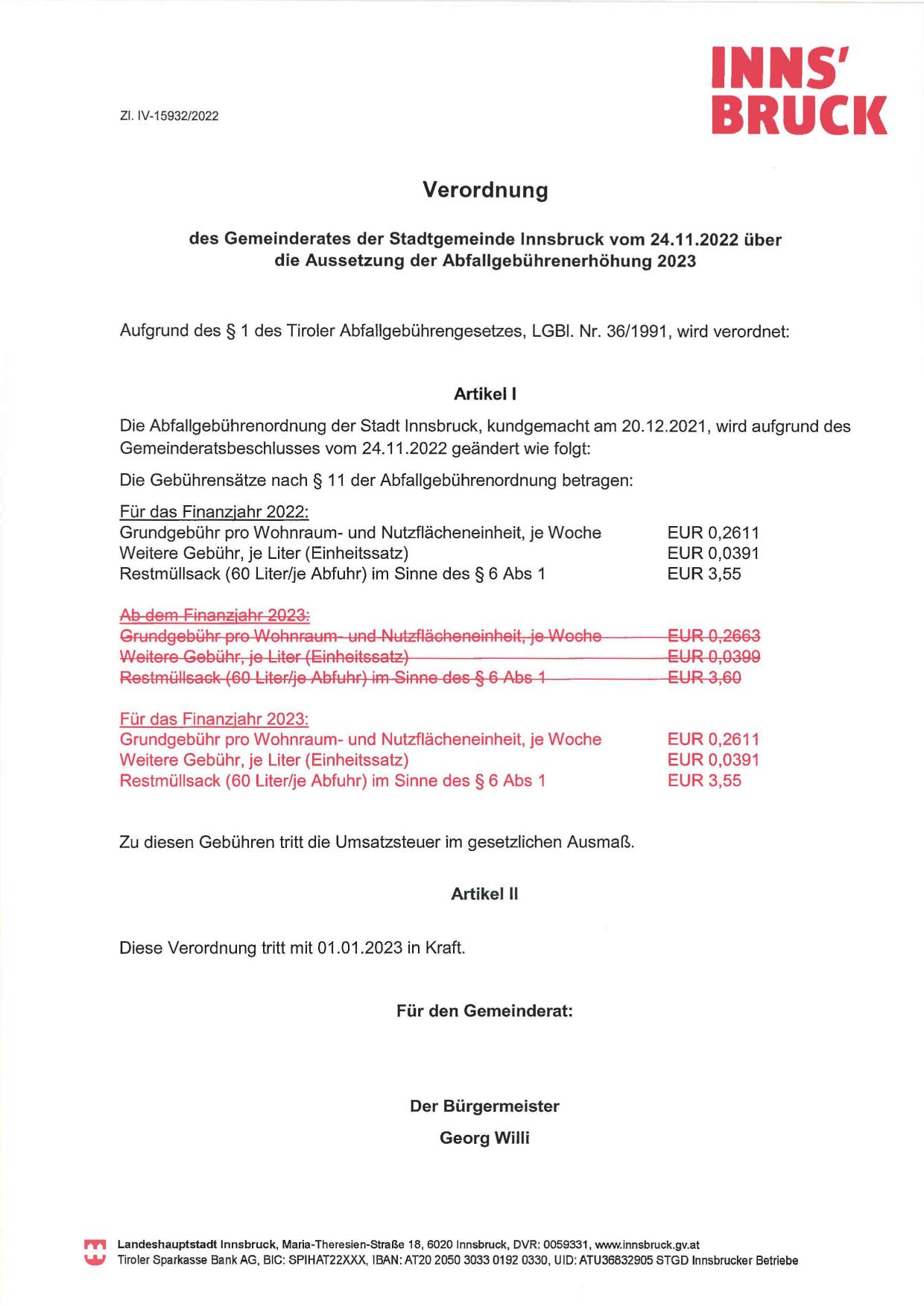 Die Abfallgebührenordnung der Stadt Innsbruck, kundgemacht am 20.12.2021 , wird aufgrund des