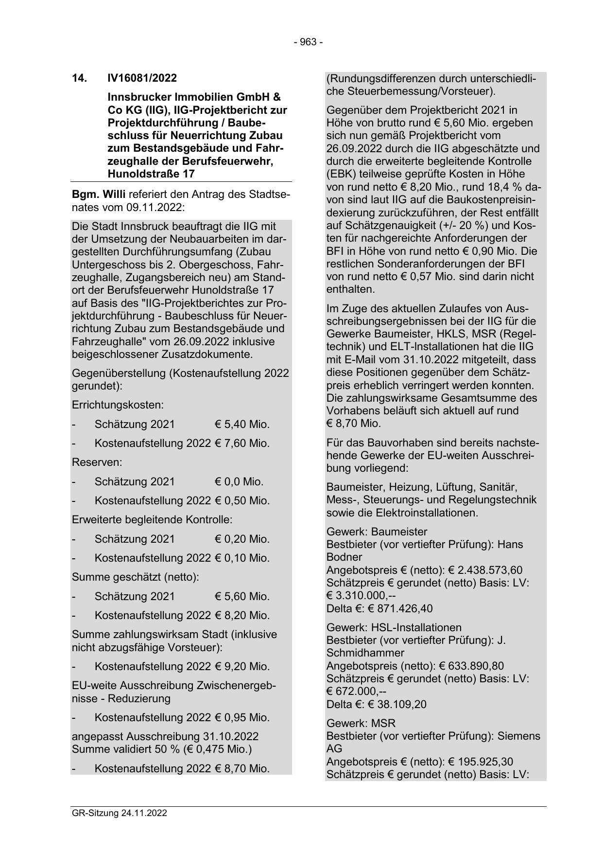 von rund netto € 8,20 Mio., rund 18,4 % davon sind laut IIG auf die Baukostenpreisindexierung zurückzuführen, der Rest entfällt