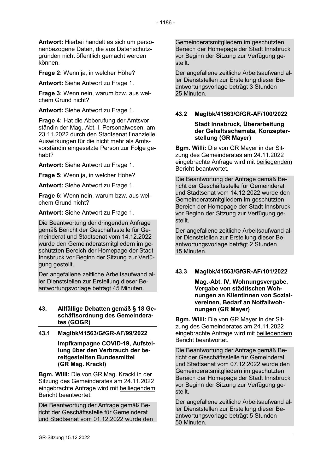 Bgm. Willi: Die von GR Mayer in der Sitzung des Gemeinderates am 24.11.2022