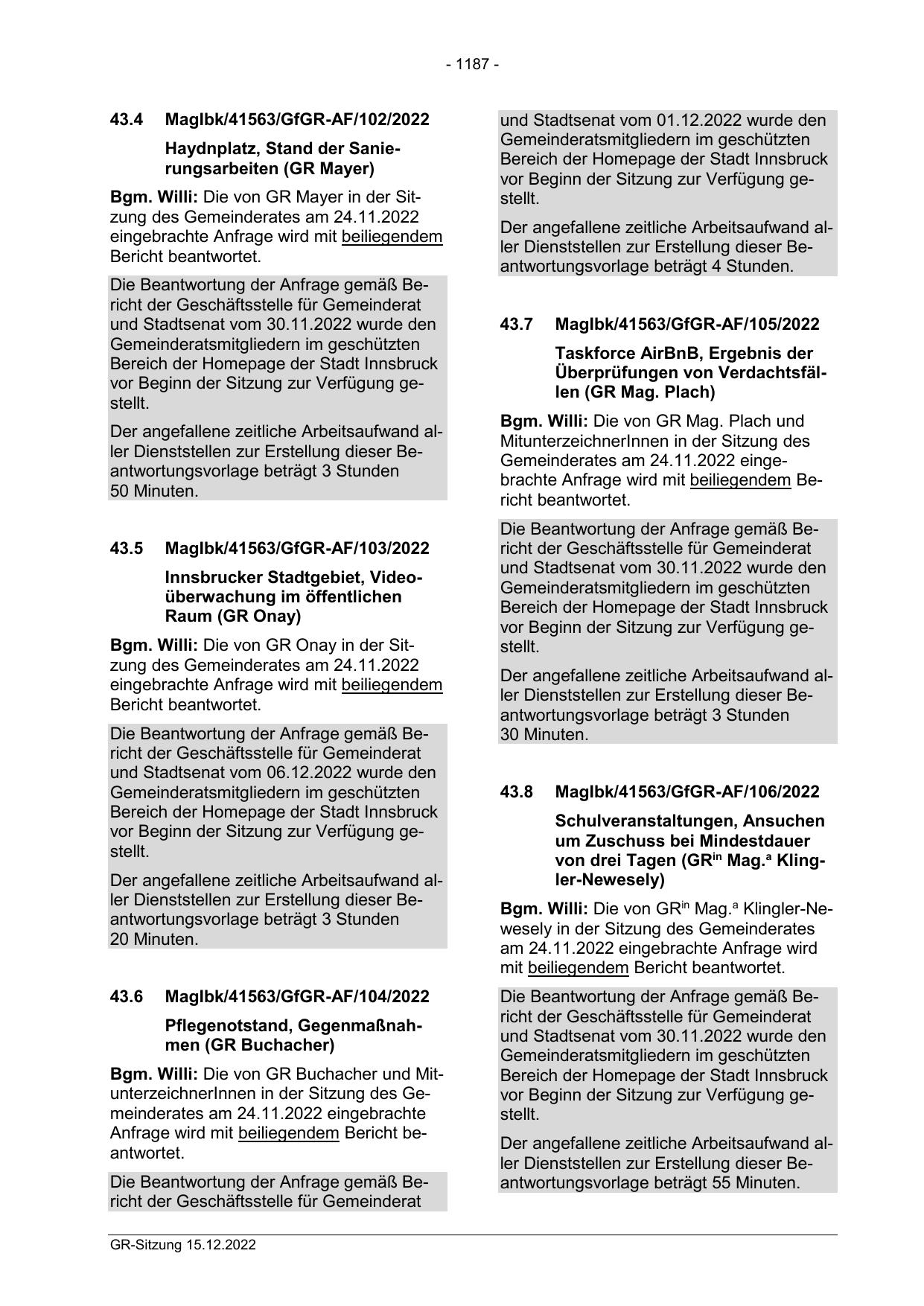 Bgm. Willi: Die von GR Mayer in der Sitzung des Gemeinderates am 24.11.2022