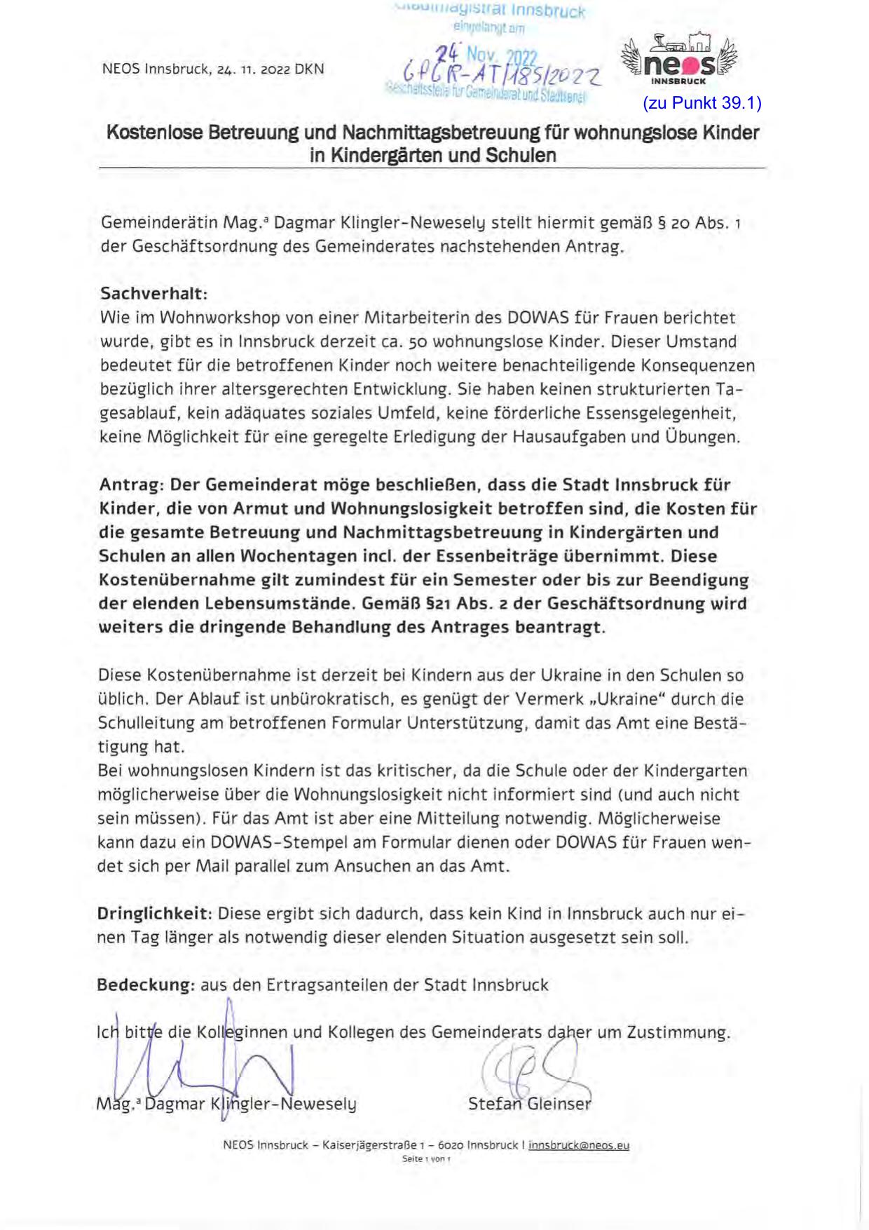 Dringlichkeit: Diese ergibt sich dadurch, dass kein Kind in Innsbruck auch nur einen Tag länger als notwendig dieser elenden Situation ausgesetzt sein soll.