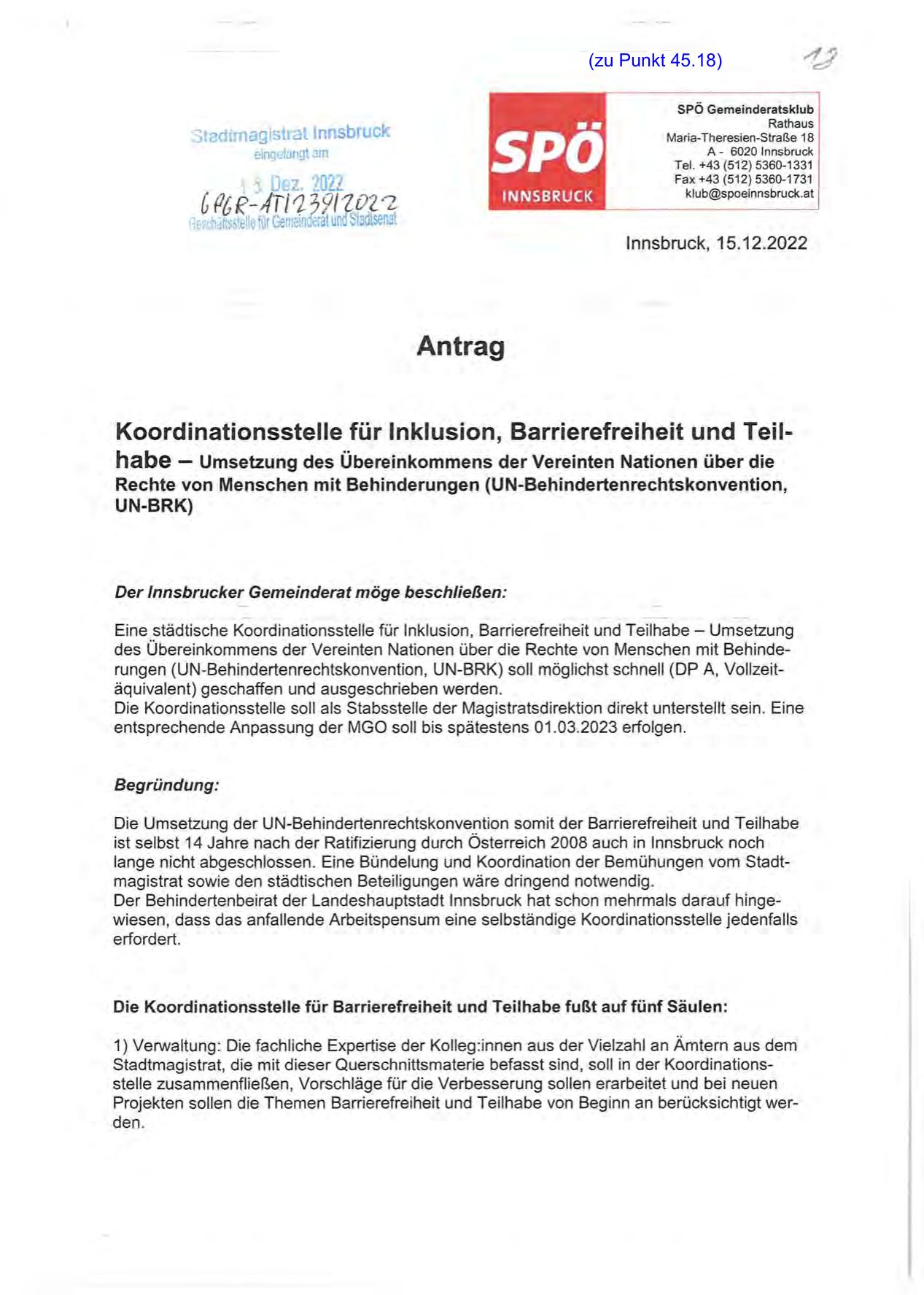 Der Behindertenbeirat der Landeshauptstadt Innsbruck hat schon mehrmals darauf hingewiesen, dass das anfallende Arbeitspensum eine selbständige Koordinationsstelle jedenfalls