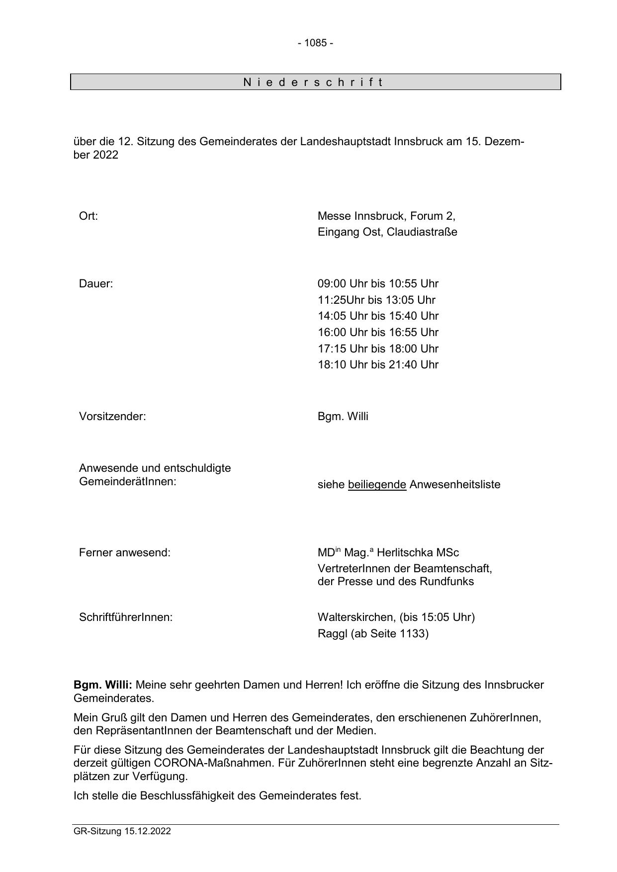 Bgm. Willi: Meine sehr geehrten Damen und Herren! Ich eröffne die Sitzung des Innsbrucker