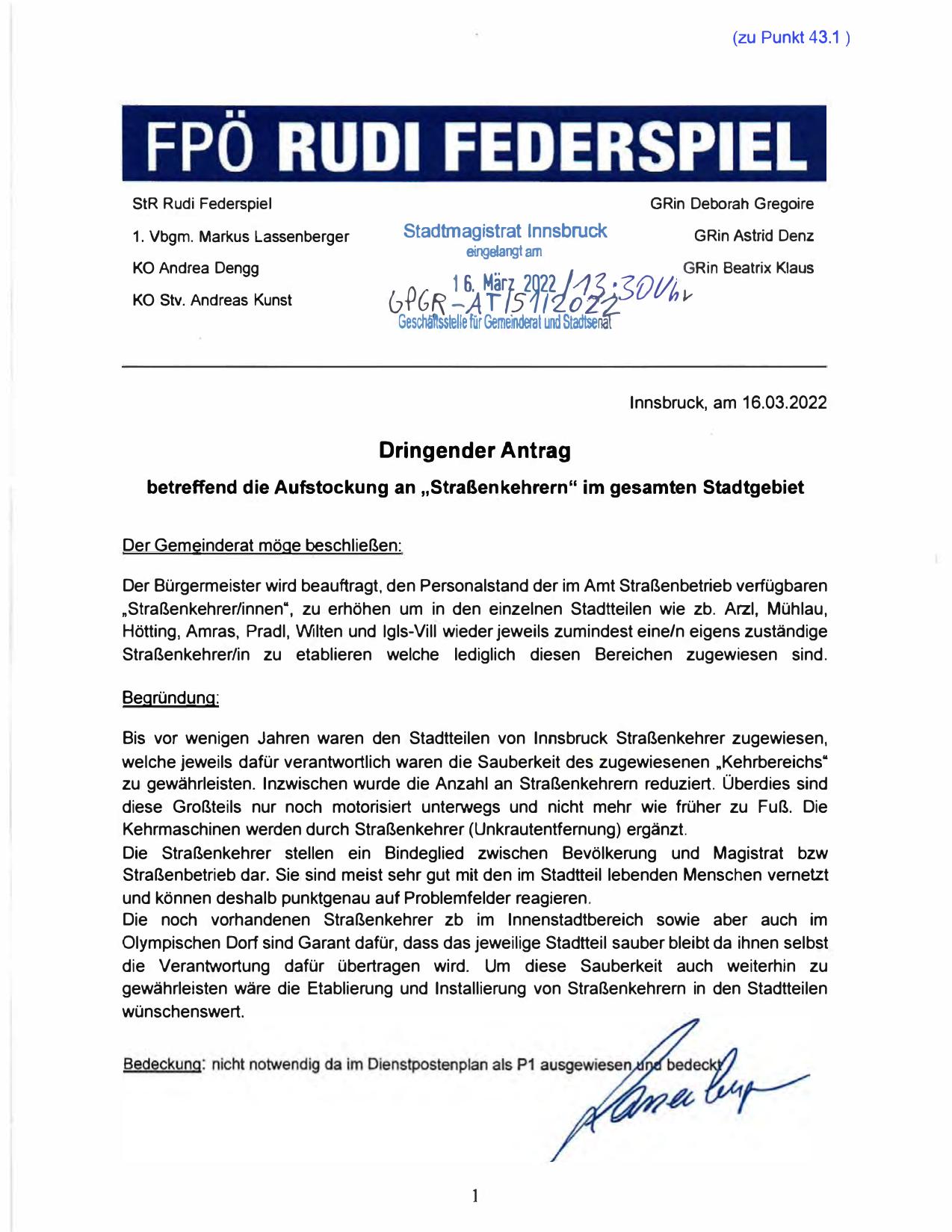 nStraßenkehrer/innen", zu erhöhen um in den einzelnen Stadtteilen wie zb. Arzl, Mühlau,