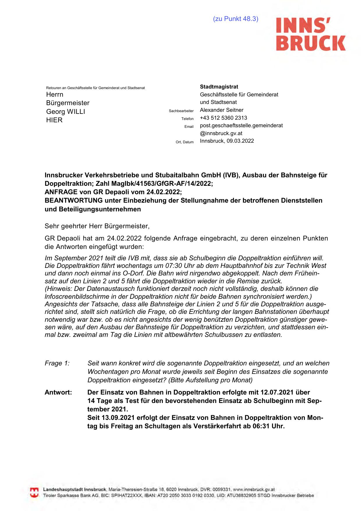 GR Depaoli hat am 24.02.2022 folgende Anfrage eingebracht, zu deren einzelnen Punkten