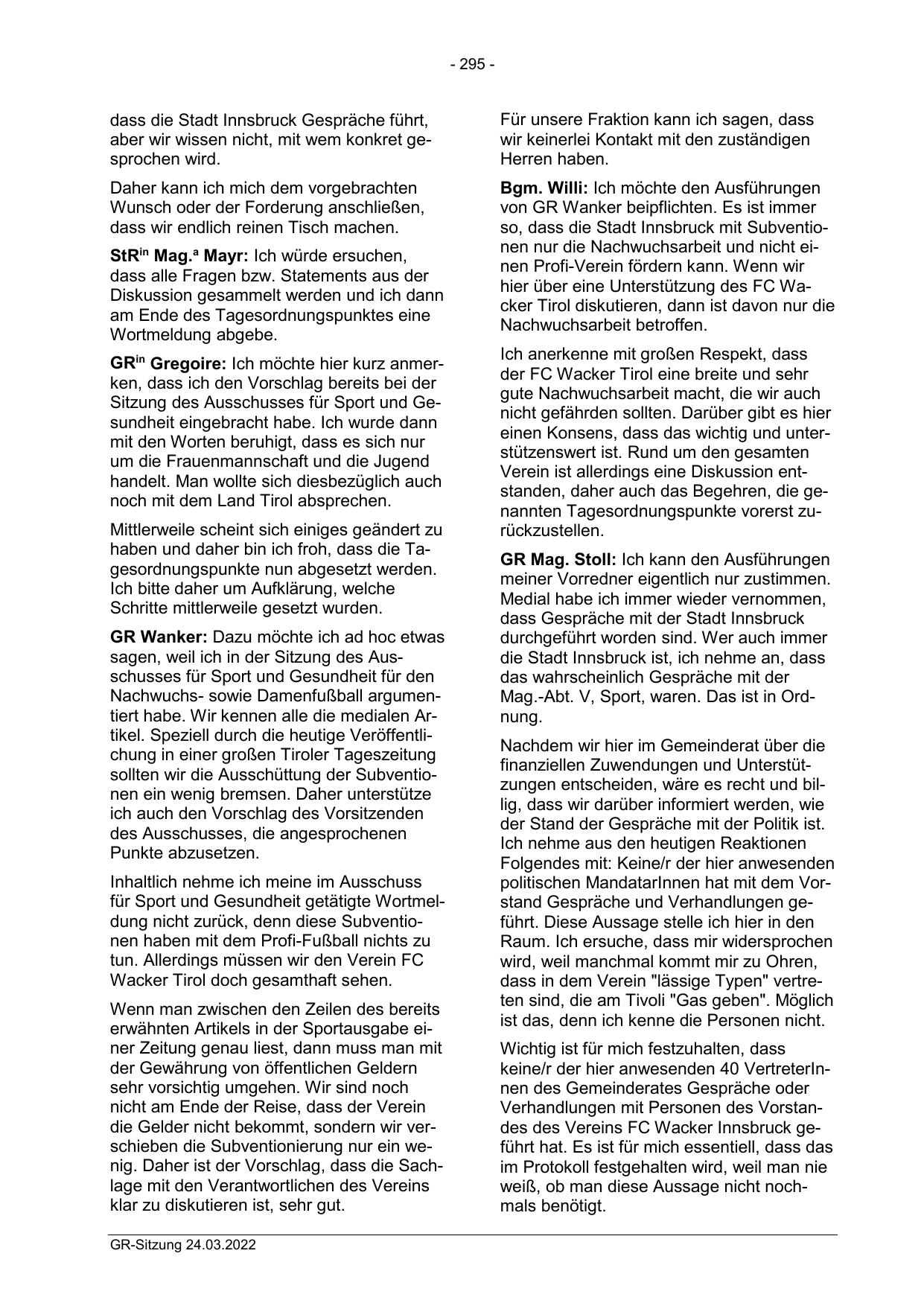 Nachwuchs- sowie Damenfußball argumentiert habe. Wir kennen alle die medialen Artikel. Speziell durch die heutige Veröffentlichung in einer großen Tiroler Tageszeitung