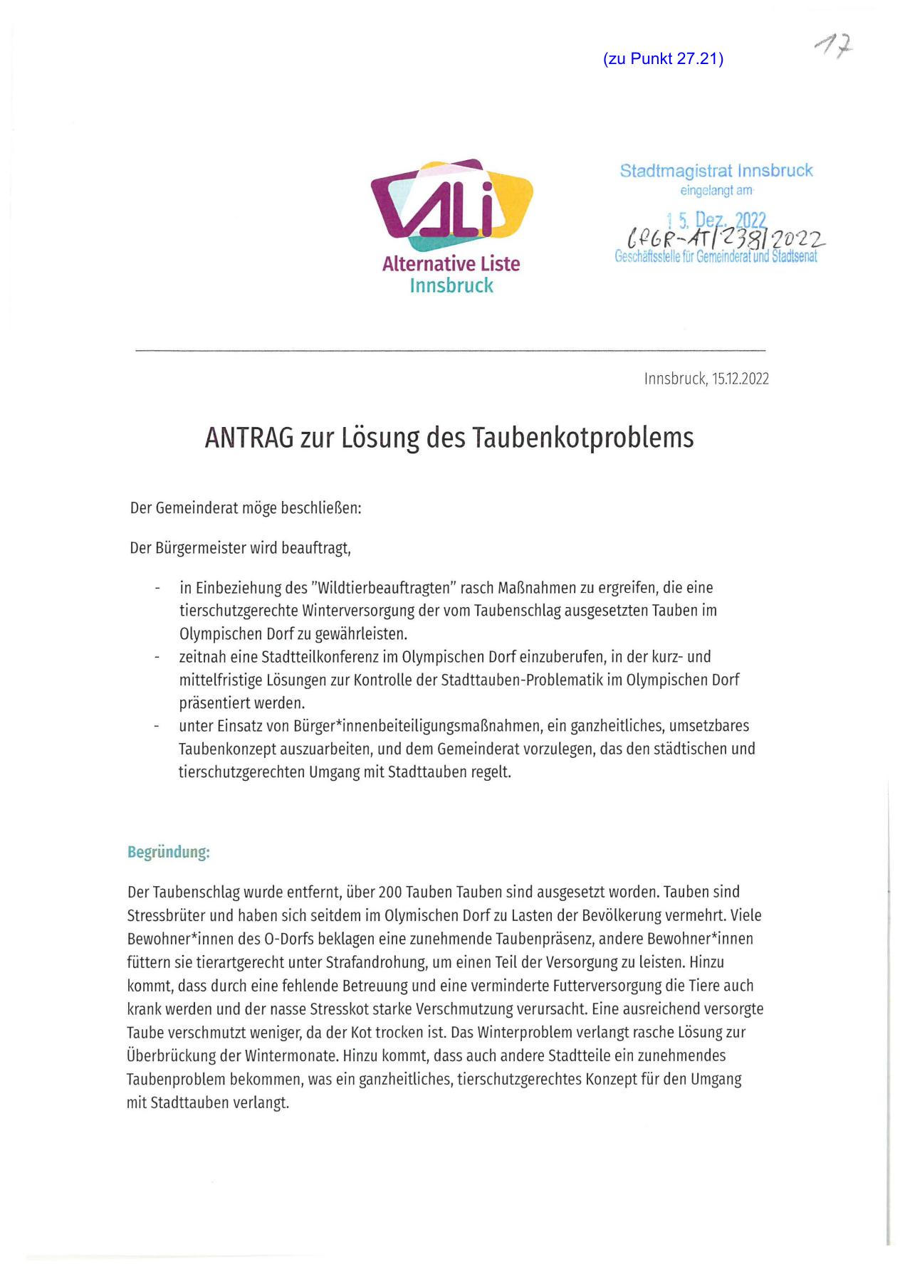 Taubenkonzept auszuarbeiten, und dem Gemeinderat vorzulegen, das den städtischen und