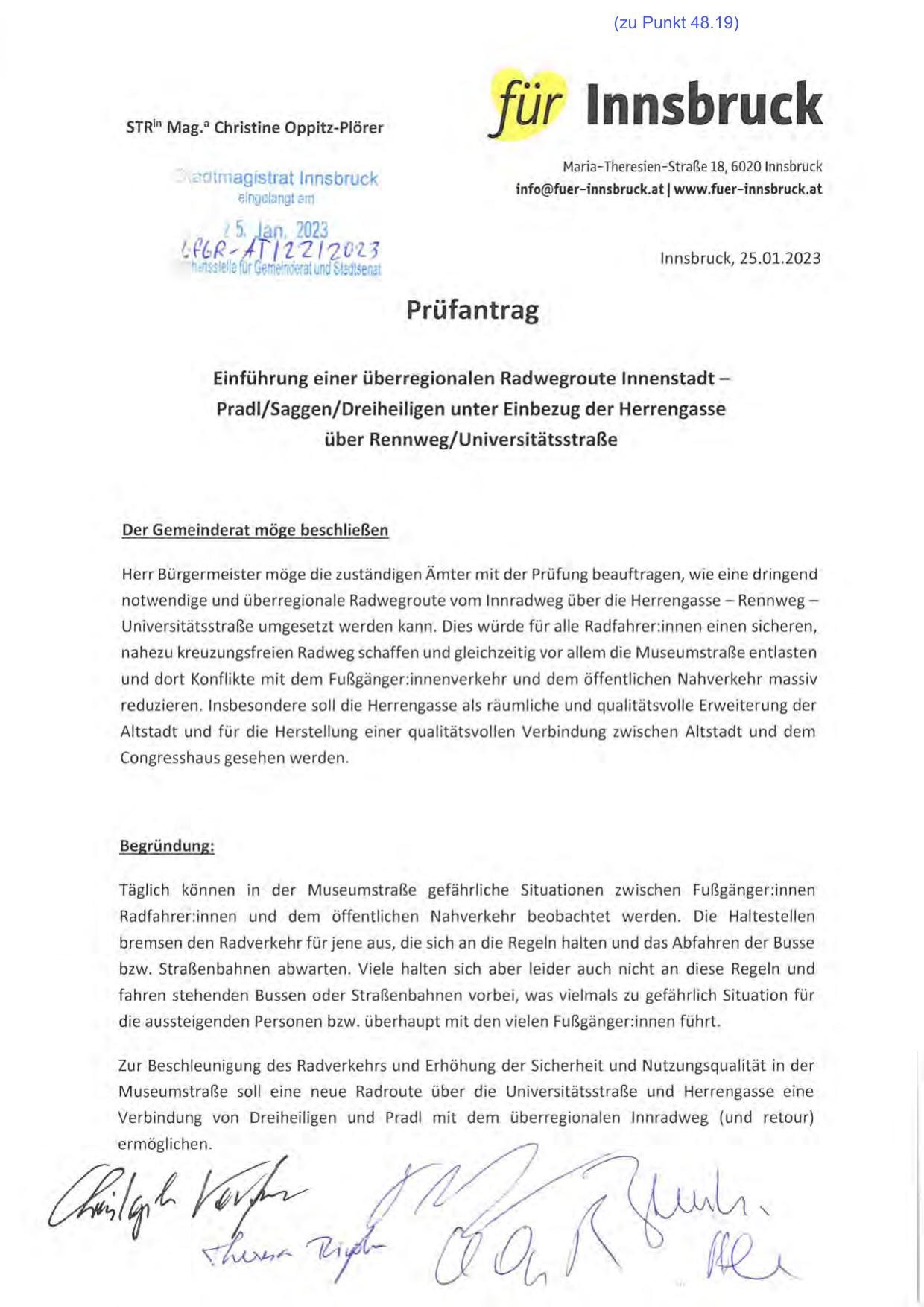 Einführung einer überregionalen Radwegroute Innenstadt Pradl/Saggen/Dreiheiligen unter Einbezug der Herrengasse