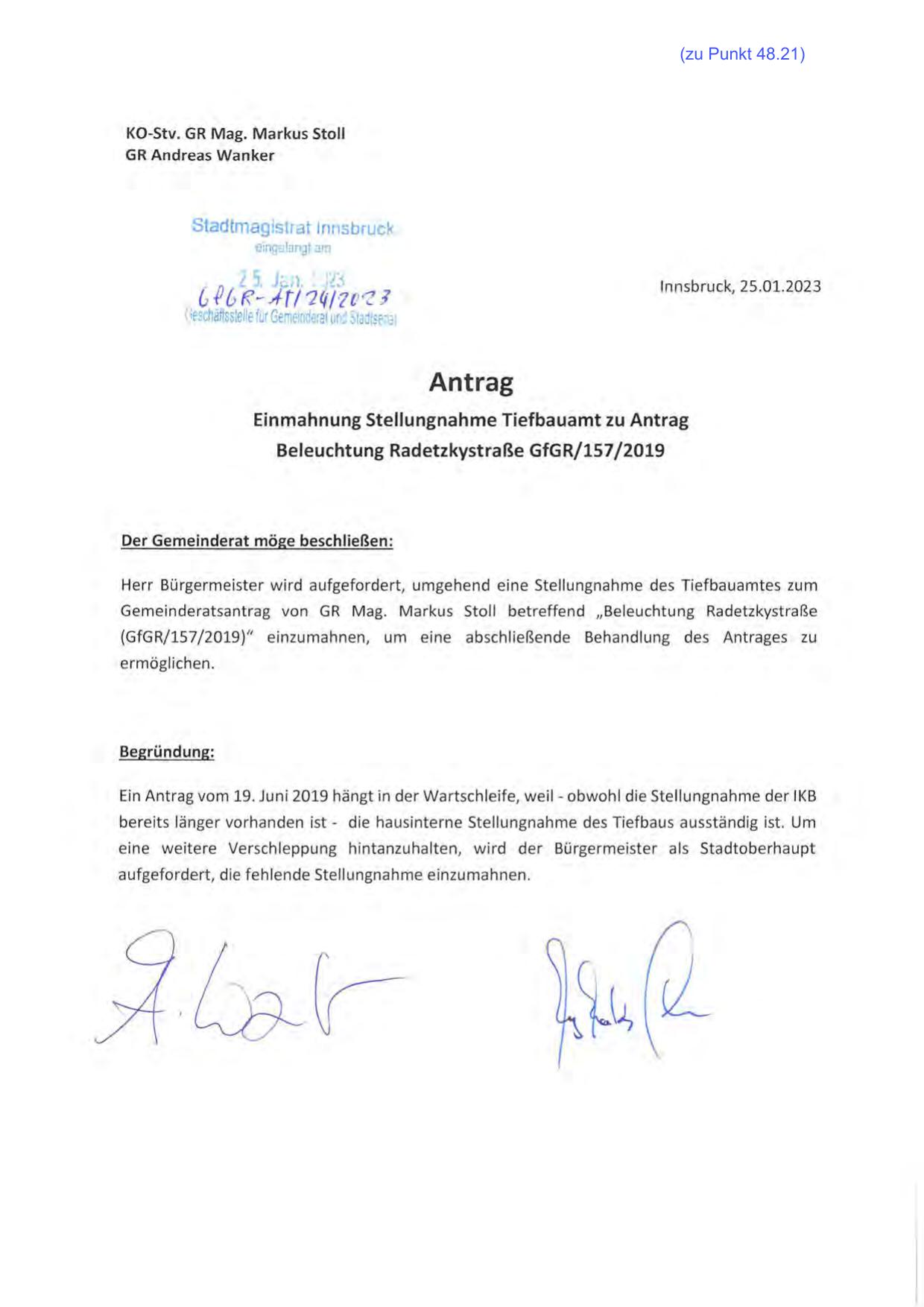 Gemeinderatsantrag von GR Mag. Markus Stall betreffend „ Beleuchtung Radetzkystraße