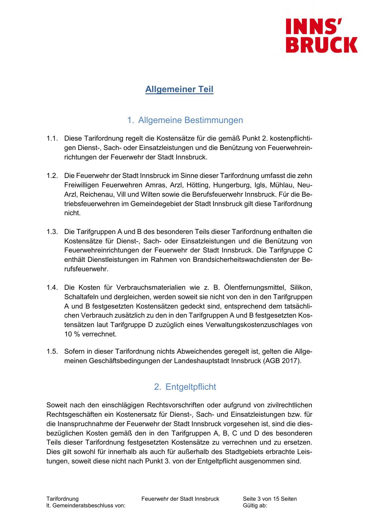 Freiwilligen Feuerwehren Amras, Arzl, Hötting, Hungerburg, Igls, Mühlau, NeuArzl, Reichenau, Vill und Wilten sowie die Berufsfeuerwehr Innsbruck. Für die Betriebsfeuerwehren im Gemeindegebiet der Stadt Innsbruck gilt diese Tarifordnung