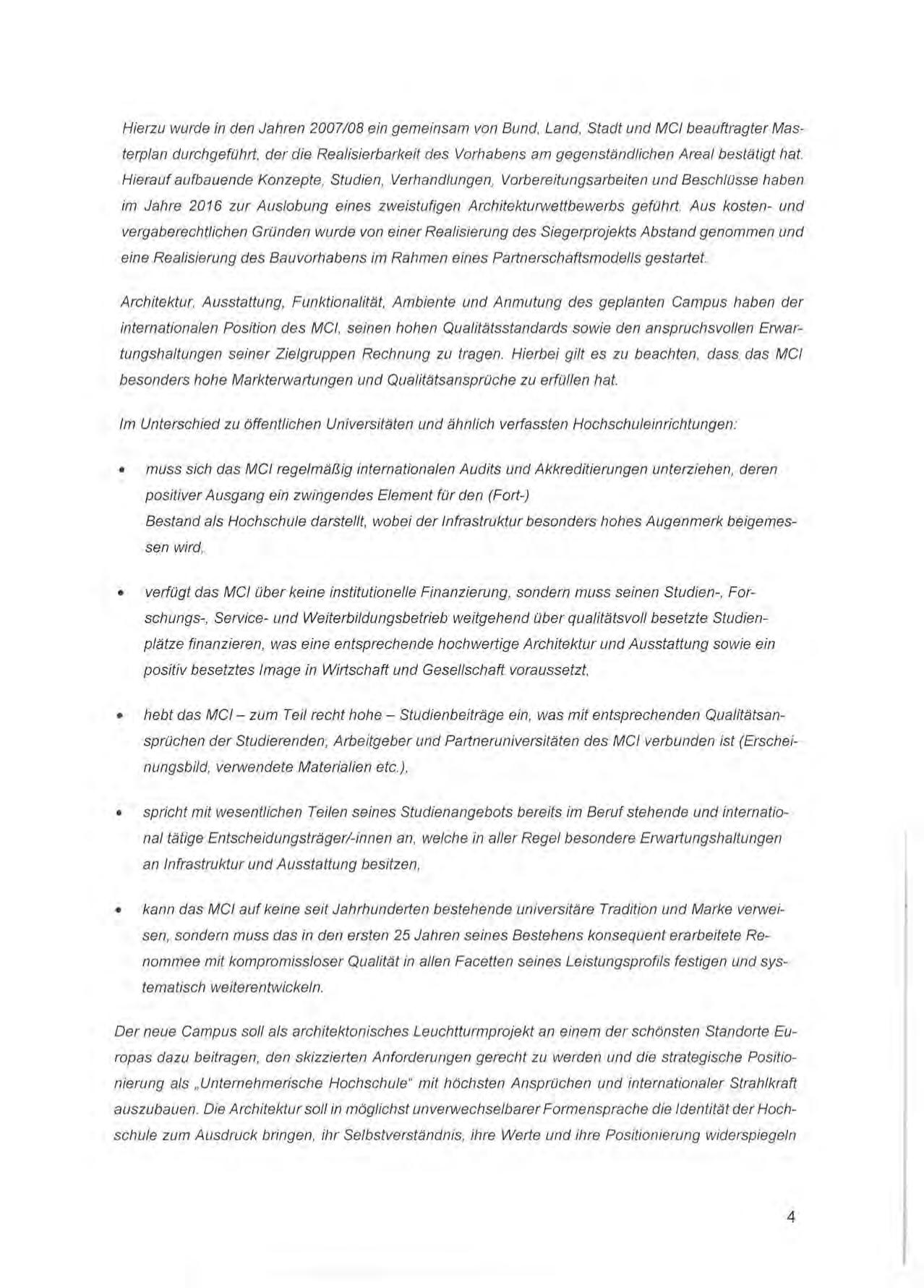 Hierzu wurde in den Jahren 2007/08 ein gemeinsam von Bund, Land, Stadt und MCI beauftragter Masterplan durchgeführt, der die Realisierbarkeit des Vorhabens am gegenständlichen Areal bestätigt hat.