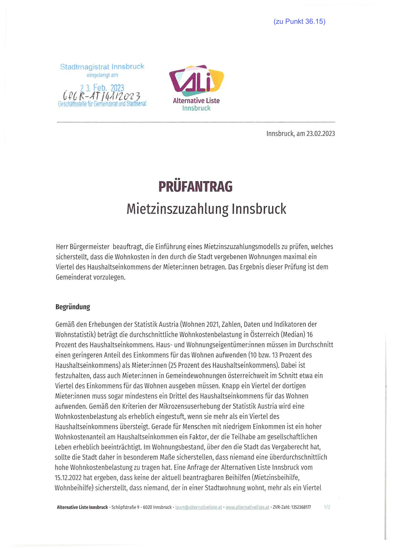hohe Wohnkostenbelastung zu tragen hat. Eine Anfrage der Alternativen Liste Innsbruck vom