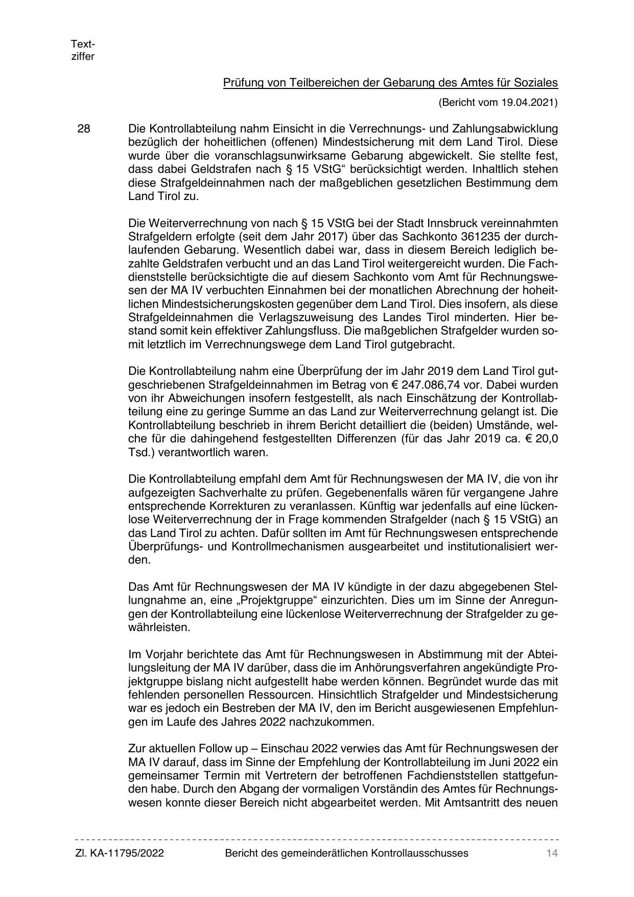 Strafgeldern erfolgte (seit dem Jahr 2017) über das Sachkonto 361235 der durchlaufenden Gebarung. Wesentlich dabei war, dass in diesem Bereich lediglich bezahlte Geldstrafen verbucht und an das Land Tirol weitergereicht wurden. Die Fachdienststelle berücksichtigte die auf diesem Sachkonto vom Amt für Rechnungswesen der MA IV verbuchten Einnahmen bei der monatlichen Abrechnung der hoheitlichen Mindestsicherungskosten gegenüber dem Land Tirol. Dies insofern, als diese