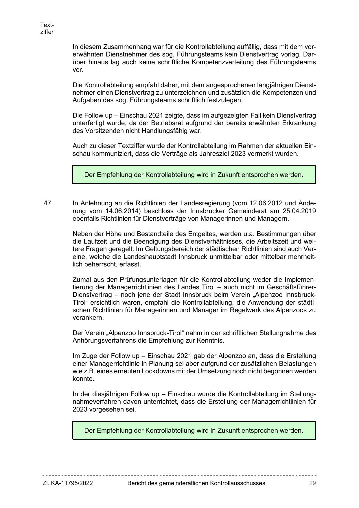 Zumal aus den Prüfungsunterlagen für die Kontrollabteilung weder die Implementierung der Managerrichtlinien des Landes Tirol – auch nicht im GeschäftsführerDienstvertrag – noch jene der Stadt Innsbruck beim Verein „Alpenzoo InnsbruckTirol“ ersichtlich waren, empfahl die Kontrollabteilung, die Anwendung der städtischen Richtlinien für Managerinnen und Manager im Regelwerk des Alpenzoos zu