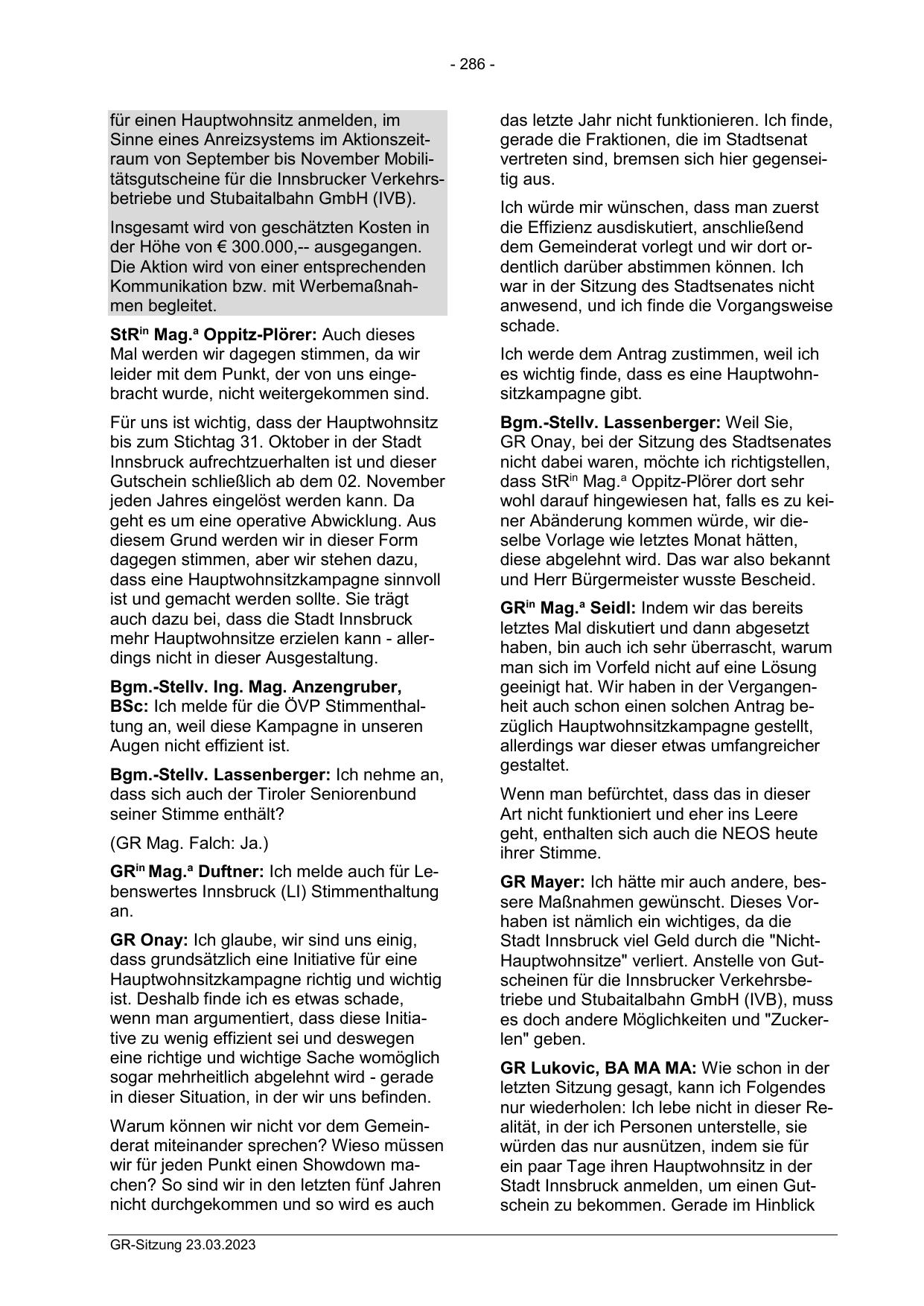 GRin Mag.a Duftner: Ich melde auch für Lebenswertes Innsbruck (LI) Stimmenthaltung