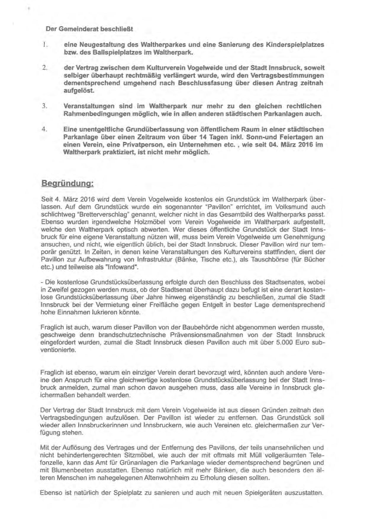 welche den Waltherpark optisch abwerten. Wer dieses öffentliche Grundstück der Stadt Innsbruck für eine eigene Veranstaltung nützen will, muss beim Verein Vogelweide um Genehmigung