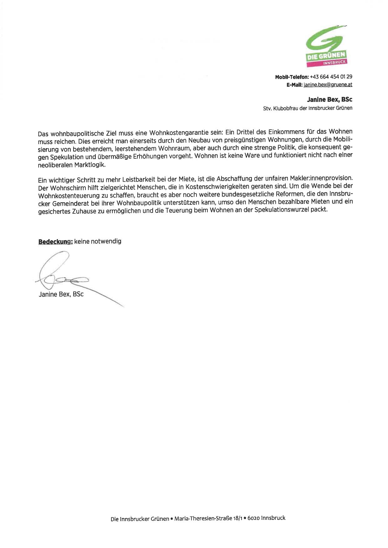 Wohnkostenteuerung zu schaffen, braucht es aber noch weitere bundesgesetzliche Reformen, die den Innsbrucker Gemeinderat bei ihrer Wohnbaupolitik unterstützen kann, umso den Menschen bezahlbare Mieten und ein