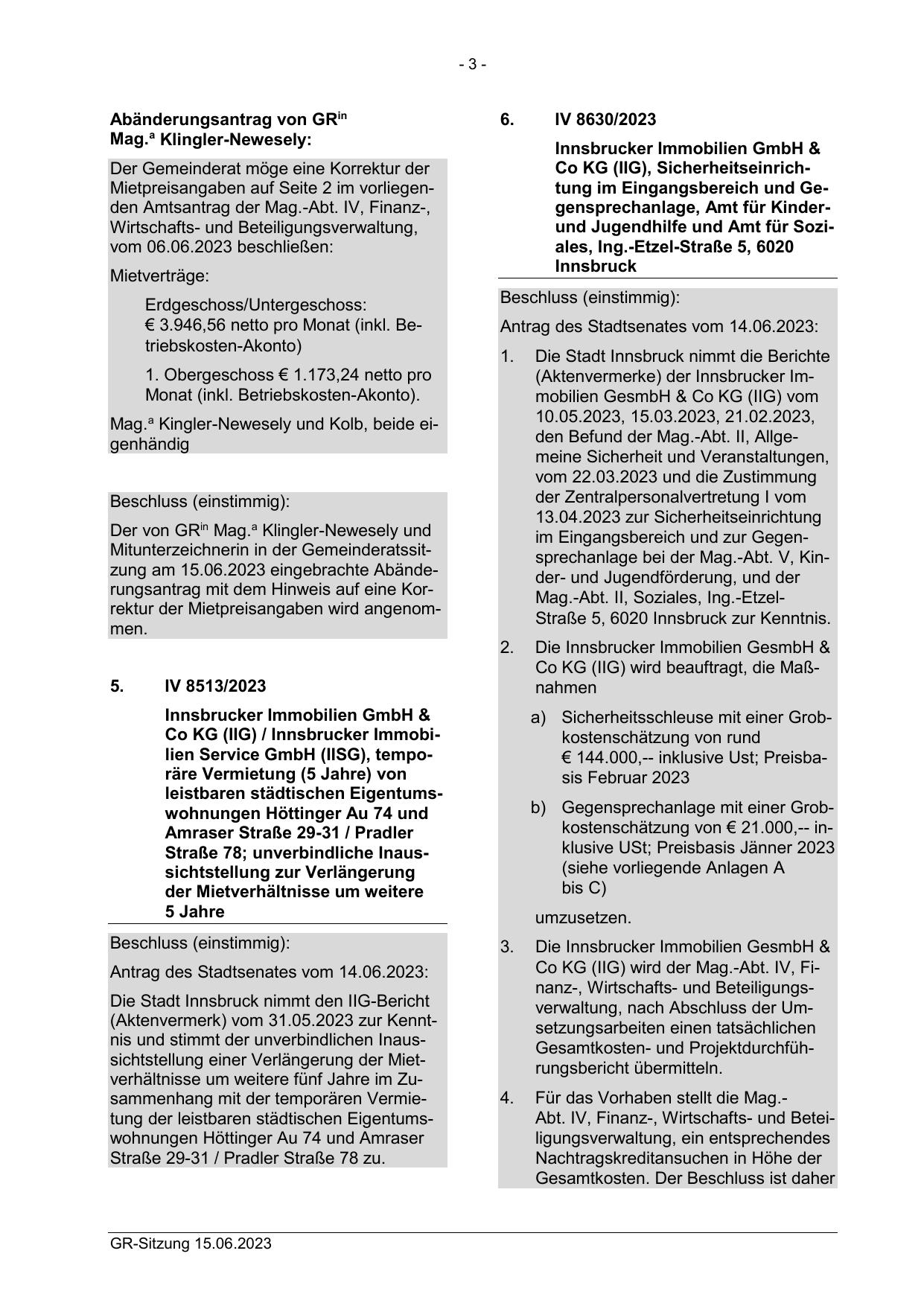 Mitunterzeichnerin in der Gemeinderatssitzung am 15.06.2023 eingebrachte Abänderungsantrag mit dem Hinweis auf eine Korrektur der Mietpreisangaben wird angenommen.