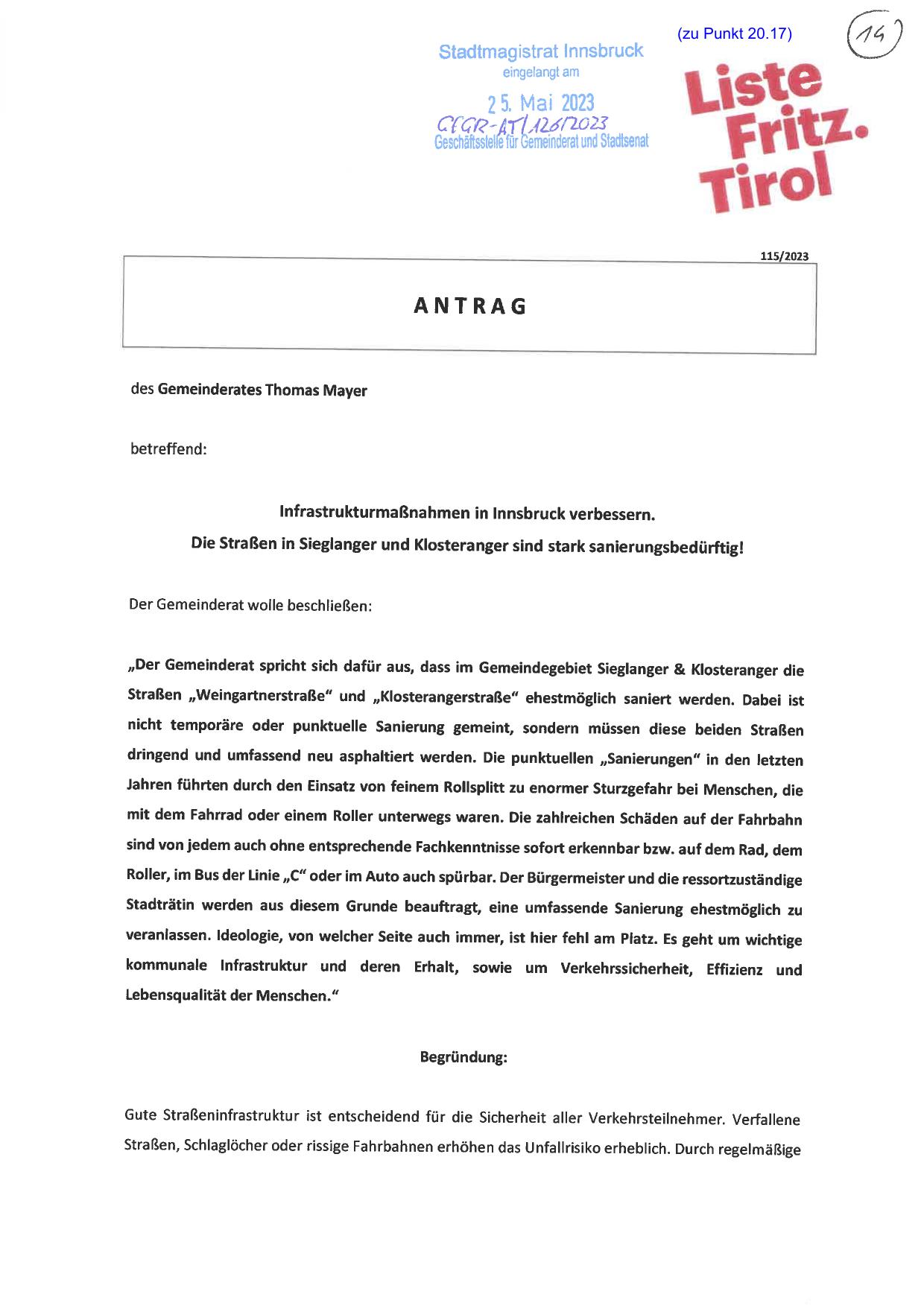 Straßen "Weingartnerstraße" und "Klosterangerstraße" ehestmöglich saniert werden. Dabei ist