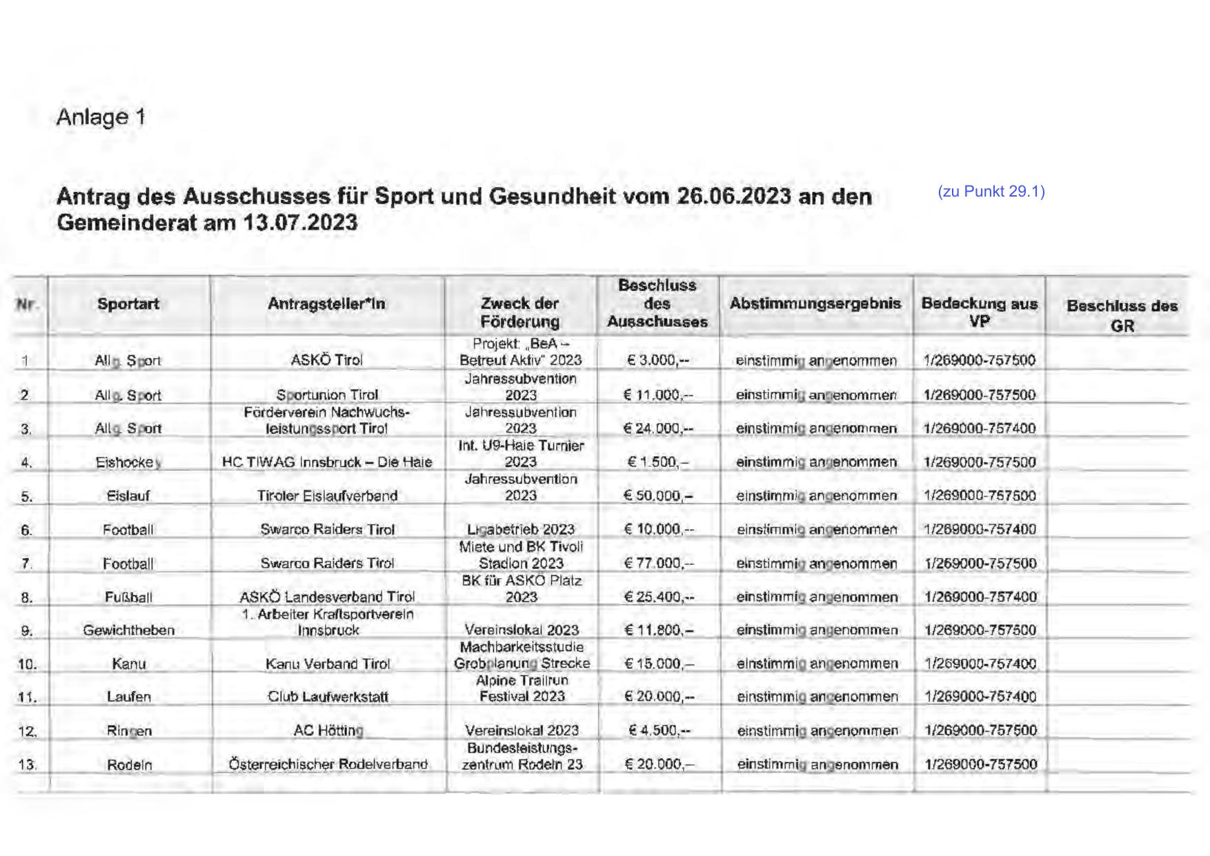 Antrag des Ausschusses für Sport und Gesundheit vom 26.06.2023 an den