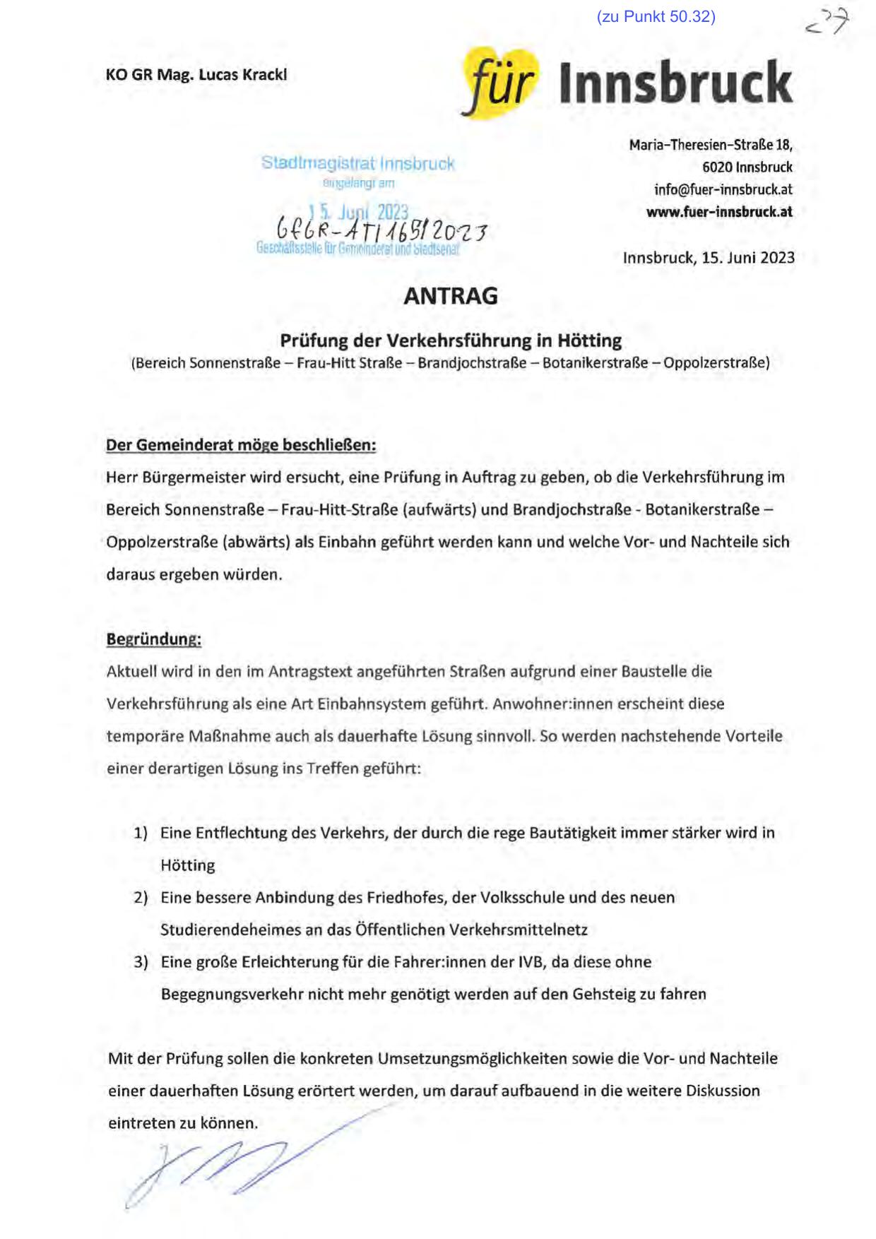 Herr Bürgermeister wird ersucht, eine Prüfung in Auftrag zu geben, ob die Verkehrsführung im