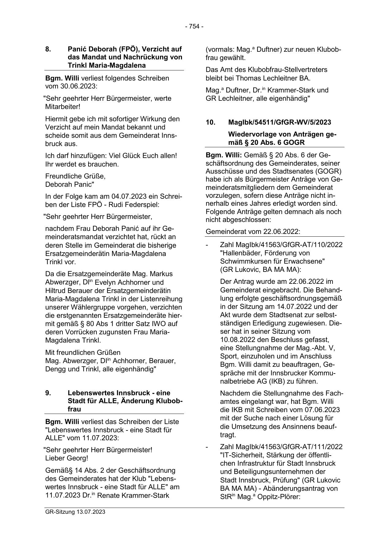 Gemeinderat eingebracht. Die Behandlung erfolgte geschäftsordnungsgemäß