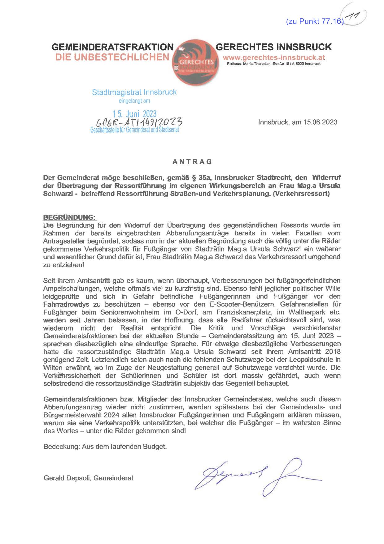 Der Gemeinderat möge beschließen, gemäß § 35a, lnnsbrucker Stadtrecht, den Widerruf