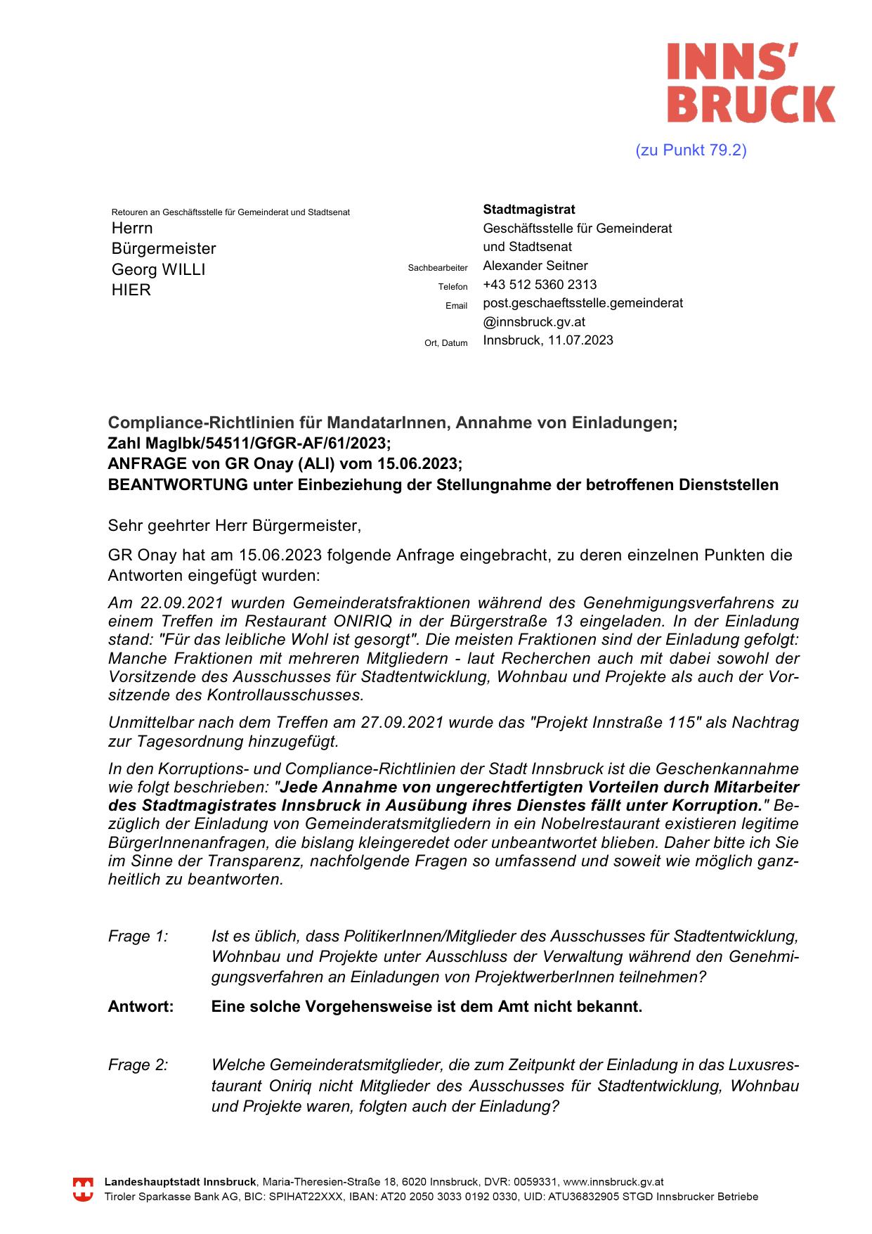 des Stadtmagistrates Innsbruck in Ausübung ihres Dienstes fällt unter Korruption." Bezüglich der Einladung von Gemeinderatsmitgliedern in ein Nobelrestaurant existieren legitime
