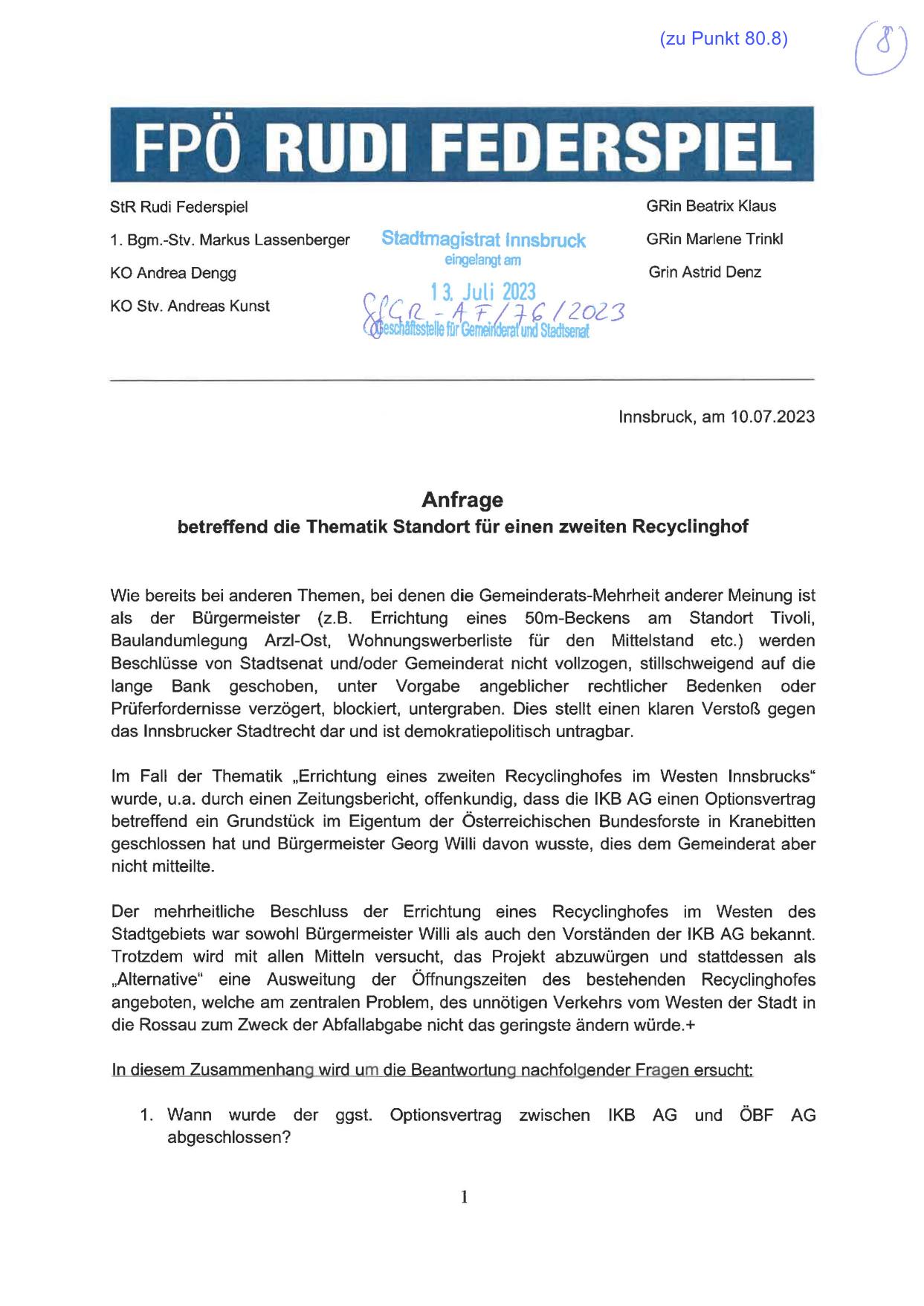 Im Fall der Thematik „Errichtung eines zweiten Recyclinghofes im Westen lnnsbrucks"
