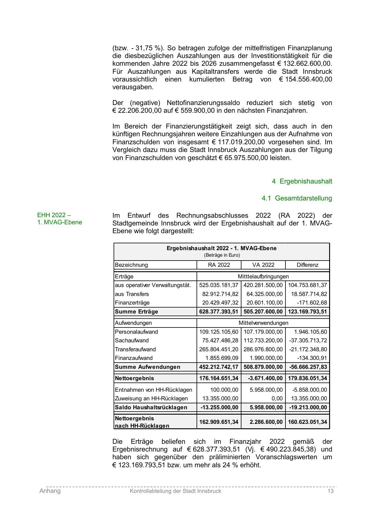 Stadtgemeinde Innsbruck wird der Ergebnishaushalt auf der 1. MVAGEbene wie folgt dargestellt: