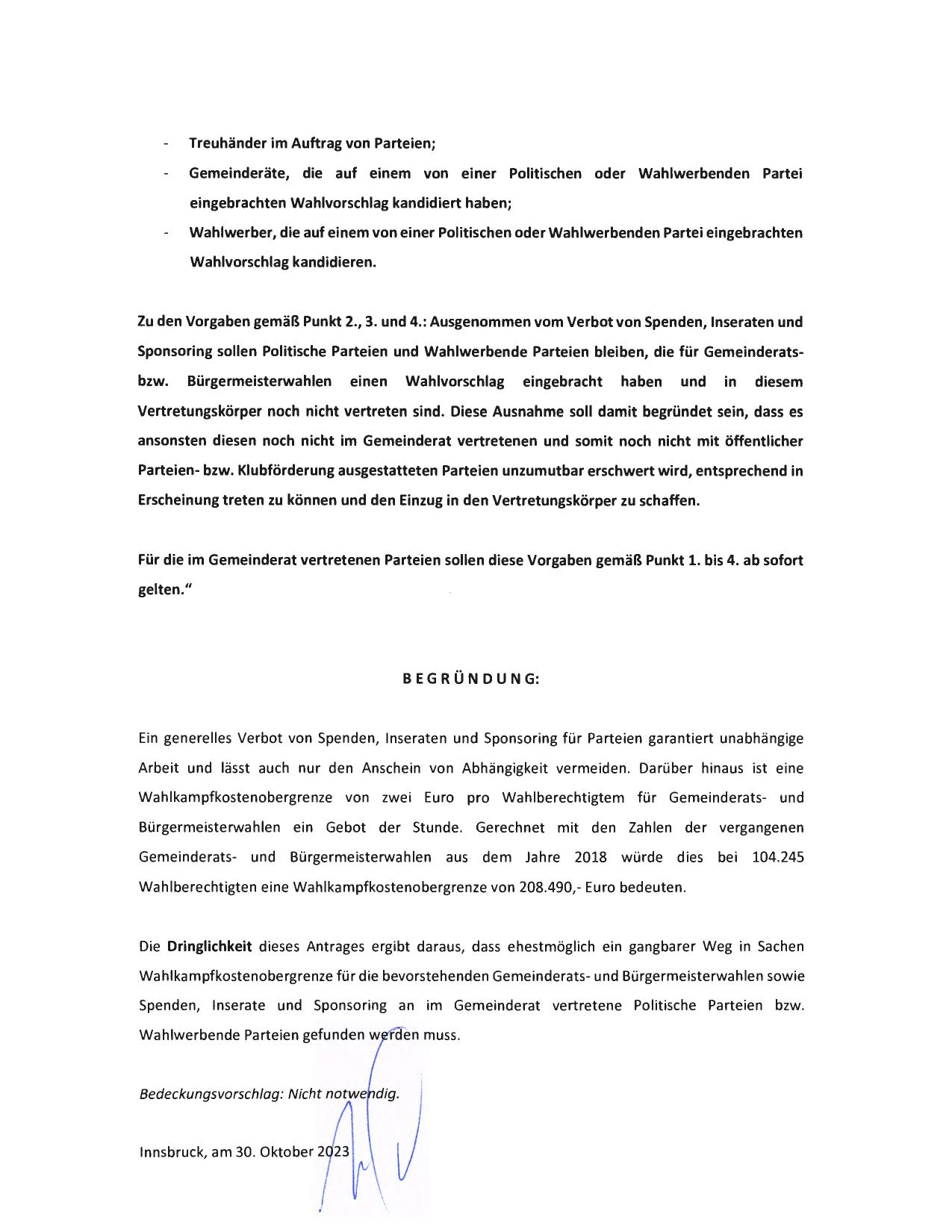 Für die im Gemeinderat vertretenen Parteien sollen diese Vorgaben gemäß Punkt 1. bis 4. ab sofort