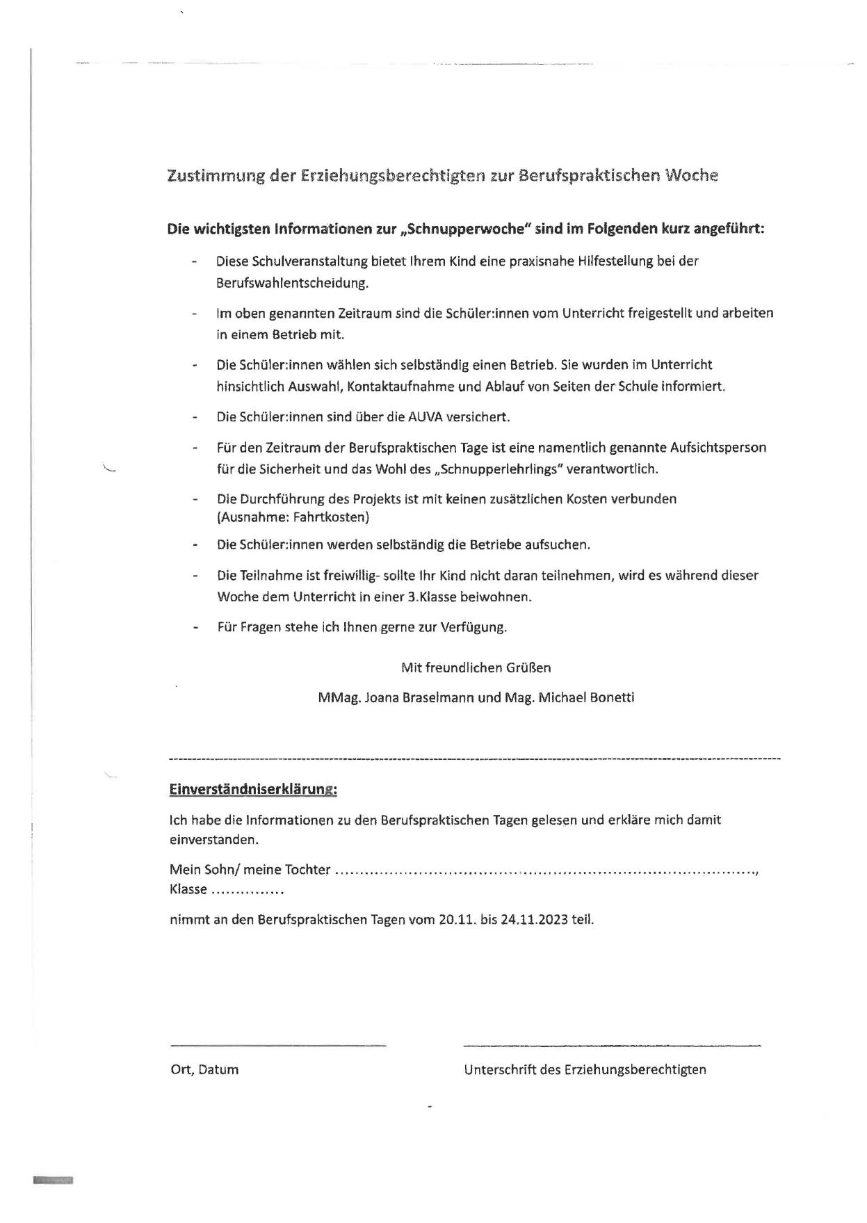 Zustimmung der Erziehungsberechtigten zur Berufspra ktischen vVoche