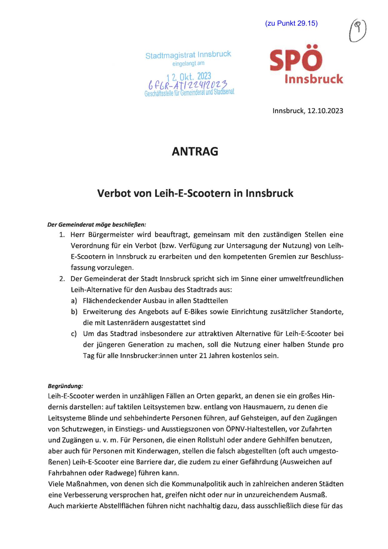 Verordnung für ein Verbot (bzw. Verfügung zur Untersagung der Nutzung) von LeihE-Scootern in Innsbruck zu erarbeiten und den kompetenten Gremien zur Beschlussfassung vorzulegen.