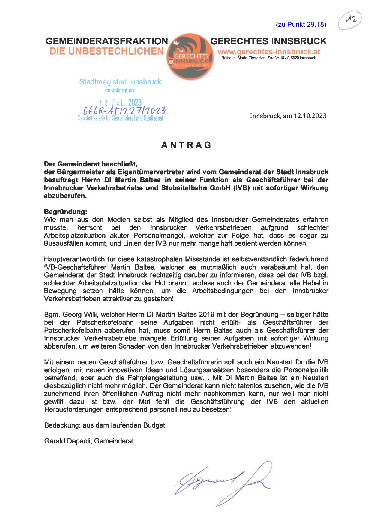 Gemeinderat der Stadt Innsbruck rechtzeitig darüber zu informieren, dass bei der IVB bzgl.