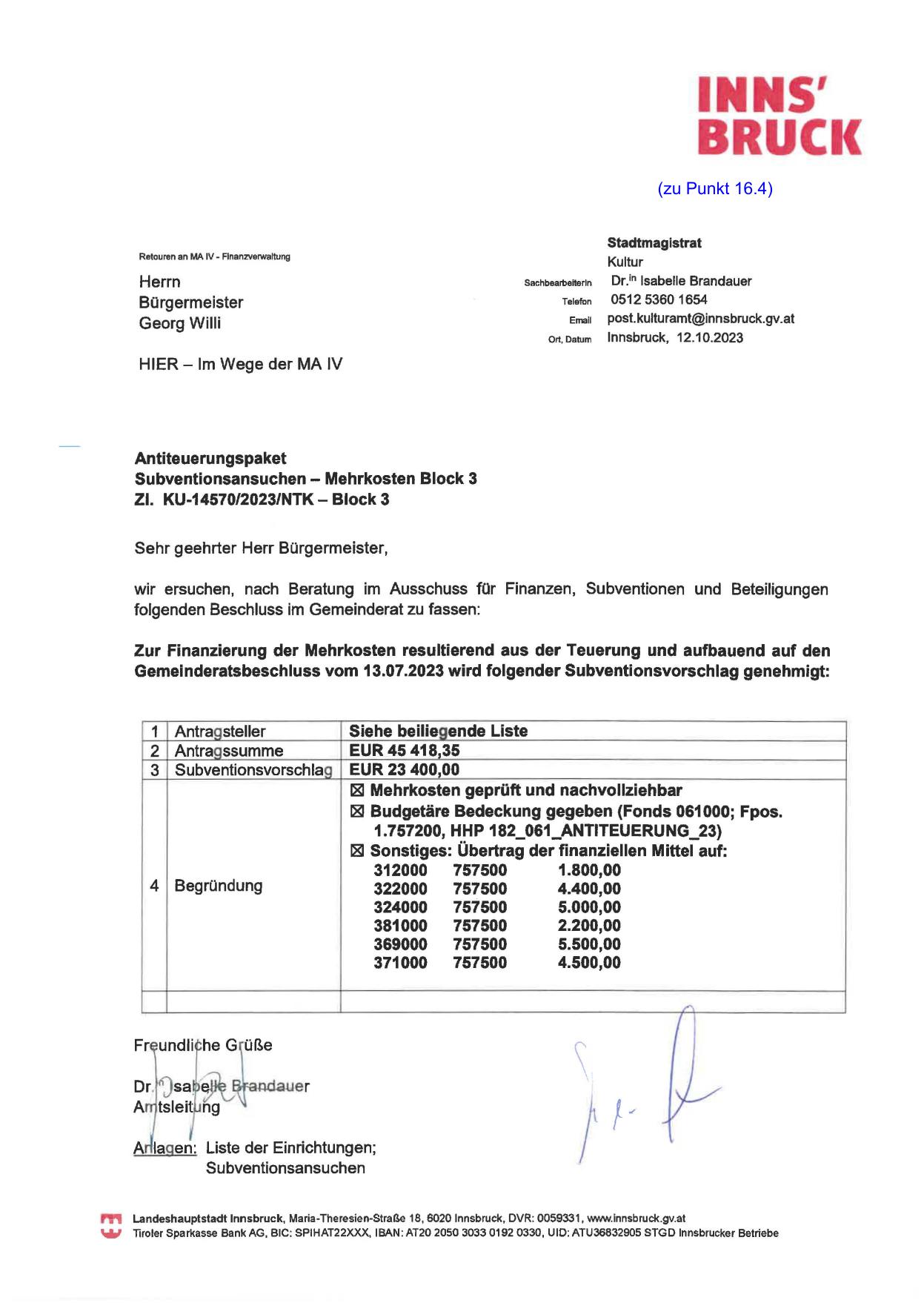 Subventionsansuchen - Mehrkosten Block 3