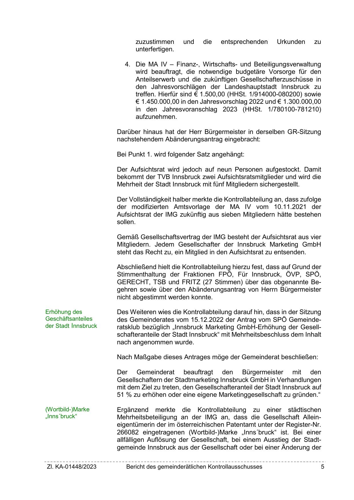 des Gemeinderates vom 15.12.2022 der Antrag vom SPÖ Gemeinderatsklub bezüglich „Innsbruck Marketing GmbH-Erhöhung der Gesellschafteranteile der Stadt Innsbruck“ mit Mehrheitsbeschluss dem Inhalt
