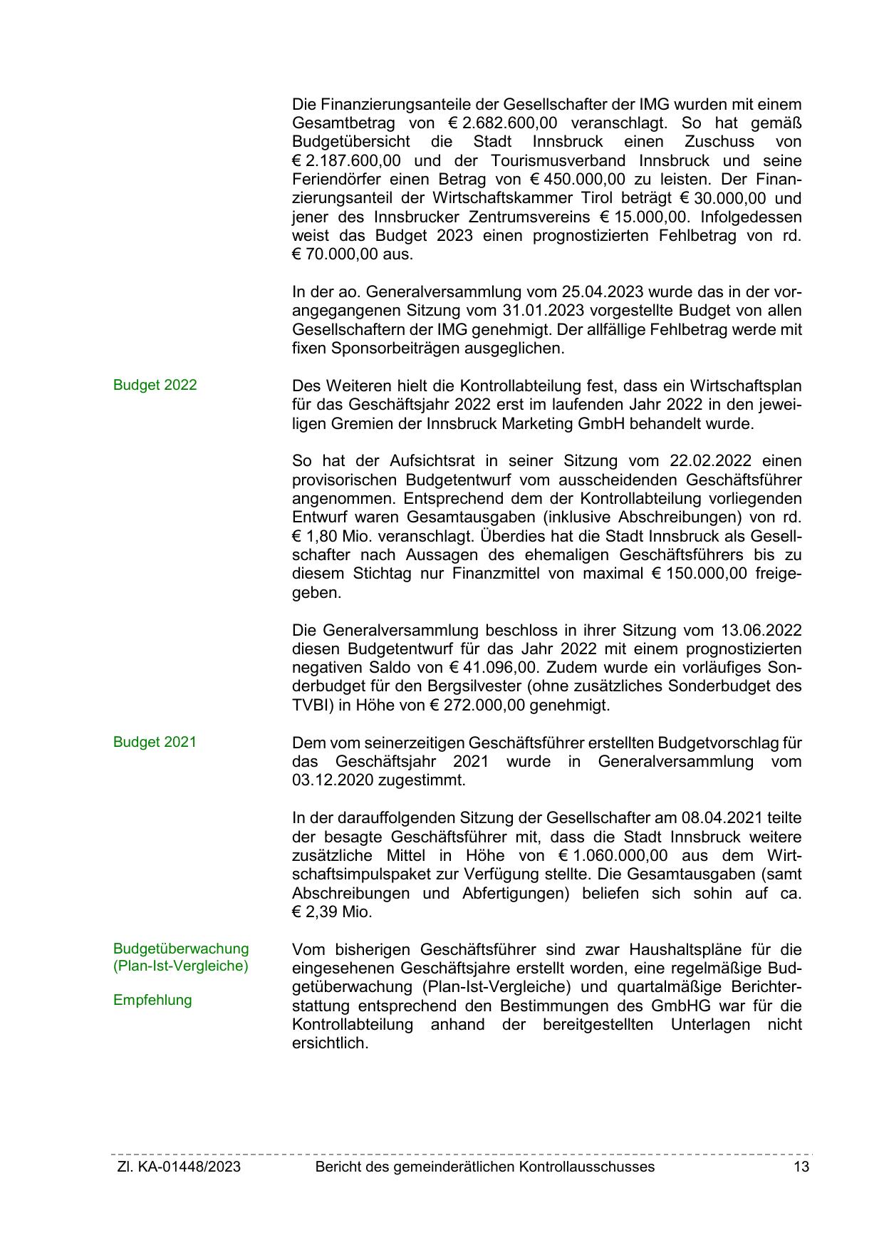 € 1,80 Mio. veranschlagt. Überdies hat die Stadt Innsbruck als Gesellschafter nach Aussagen des ehemaligen Geschäftsführers bis zu