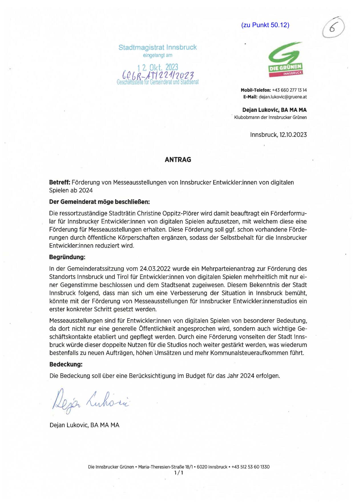 Betreff: Förderung von Messeausstellungen von lnnsbrucker Entwickler:innen von digitalen