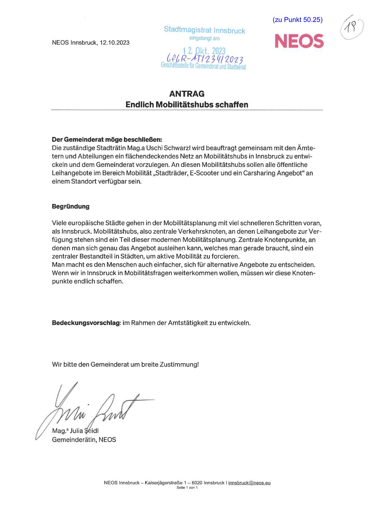 Die zuständige Stadträtin Mag.a Uschi Schwarz! wird beauftragt gemeinsam mit den Ämtetern und Abteilungen ein flächendeckendes Netz an Mobilitätshubs in Innsbruck zu entwickeln und dem Gemeinderat vorzulegen. An diesen Mobilitätshubs sollen alle öffentliche
